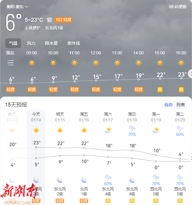 受偏南气流影响,1月14日至16日,衡东以晴到多云天气为主,气温回升。升温“高峰”将出现在1月16日白天,预计最高气温可达23℃。