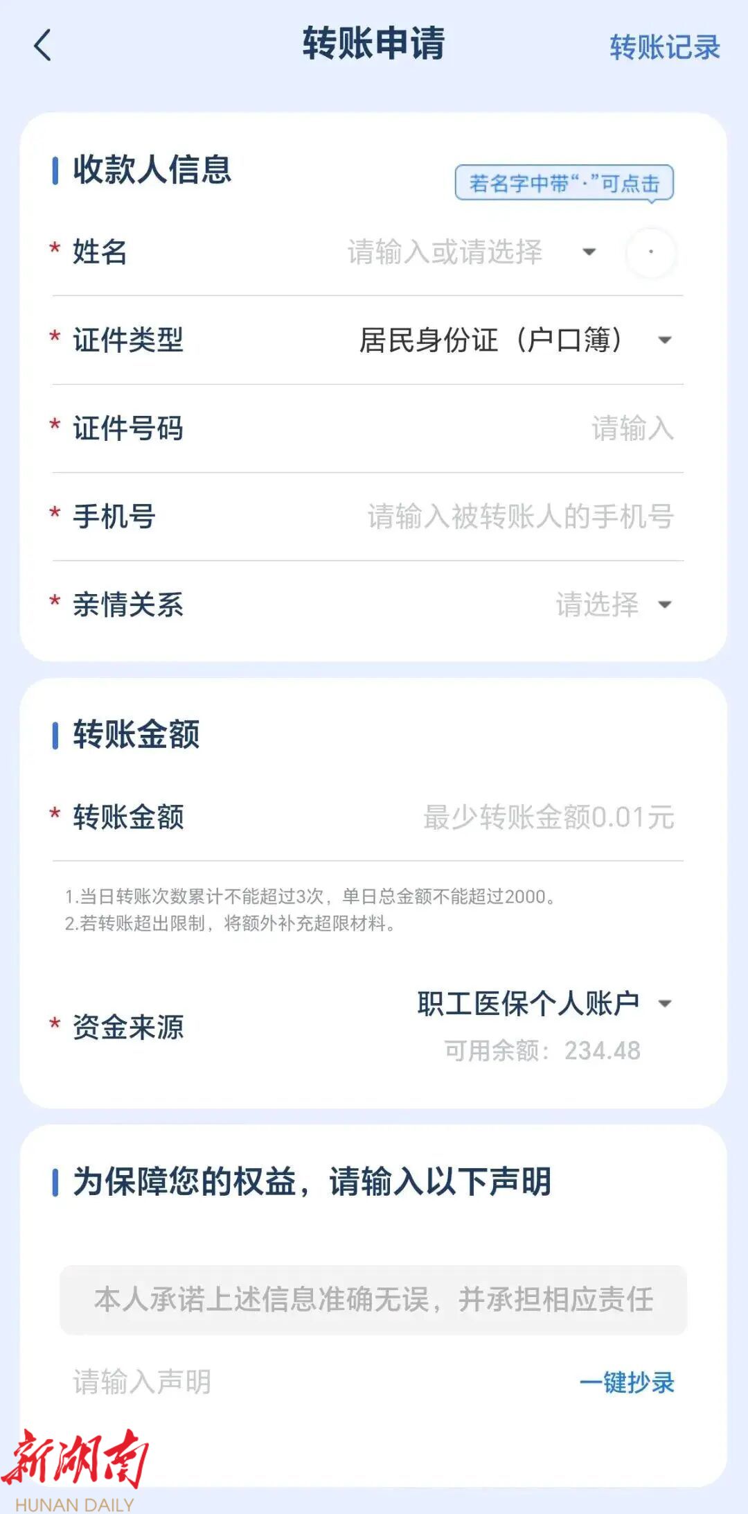 需要提示的是, 每个医保钱包账户单日限3笔转账,每笔转账金额不超过2000元。