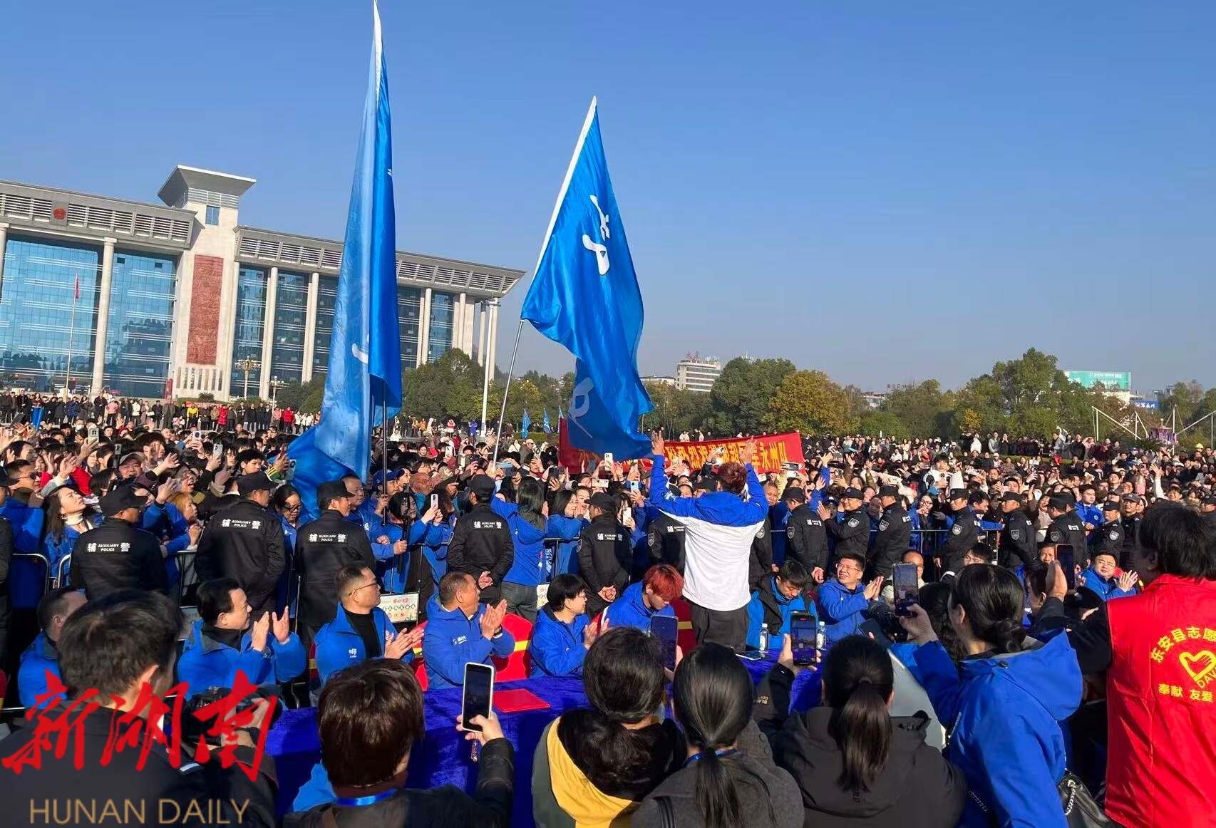活动现场,身着“永州蓝”球衣的球迷们挥舞着队旗,有序列队形成一片蓝色人潮,只为近距离一睹冠军队伍的飒爽风采。欢迎仪式上,演员们带来了精心编排的东安武术展演、文艺节目演出,向冠军之师致以热烈欢迎。少先队员们手捧鲜花,为队员们献上最纯真的敬意;球队代表分享夺冠征程中的奋斗故事与心得感悟,传递体育运动的快乐真谛与积极向上的精神力量。