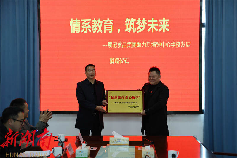 湖南日报·新湖南客户端1月13日讯(通讯员 张帆 李芳暄) 1月13日,袁记食品集团“情系教育 筑梦未来”捐赠仪式在新墙镇人民政府举行。该集团向新墙镇中心学校捐赠20万元爱心善款,以实际行动践行企业社会责任,为乡村教育发展添砖加瓦。袁记食品集团、新墙镇政府、县教体局、县红十字会相关负责人及新墙镇中心学校教师代表齐聚现场,共同见证这一暖心时刻。