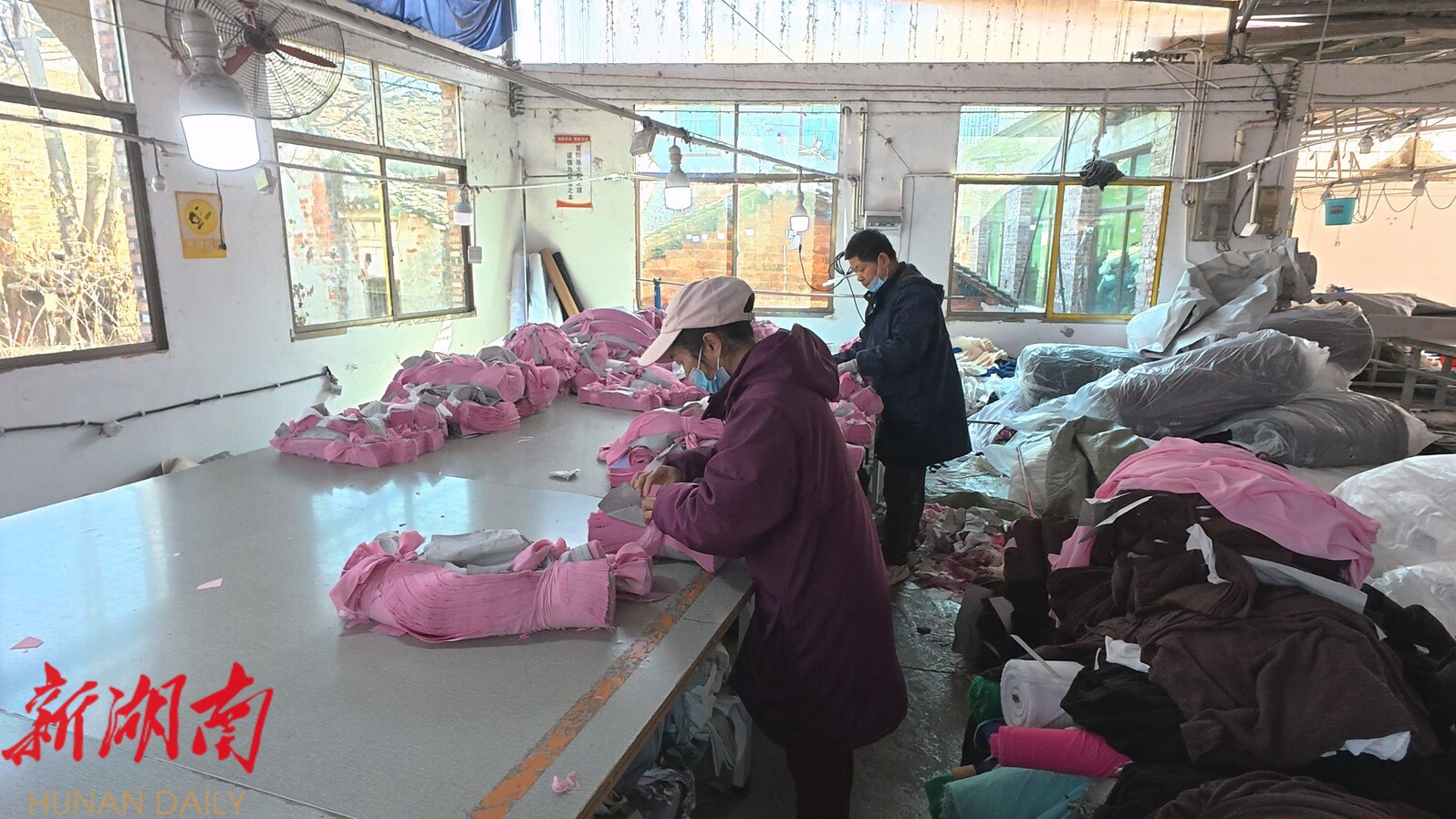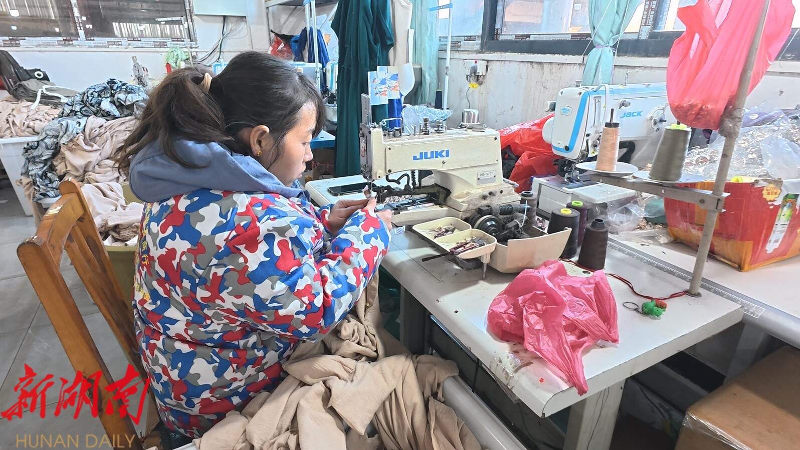 走进永兴县郎山服饰有限公司,100余名工人正专注忙碌在生产线各环节,裁剪、缝纫、包装等工序有条不紊。48岁的村民毛大姐手指翻飞,熟练操作着缝纫机,她告诉记者,以前在家只能围着灶台转,现在走路10分钟就到岗,一个月能挣3000多块,还能兼顾老人和孩子,日子过得踏实又红火。