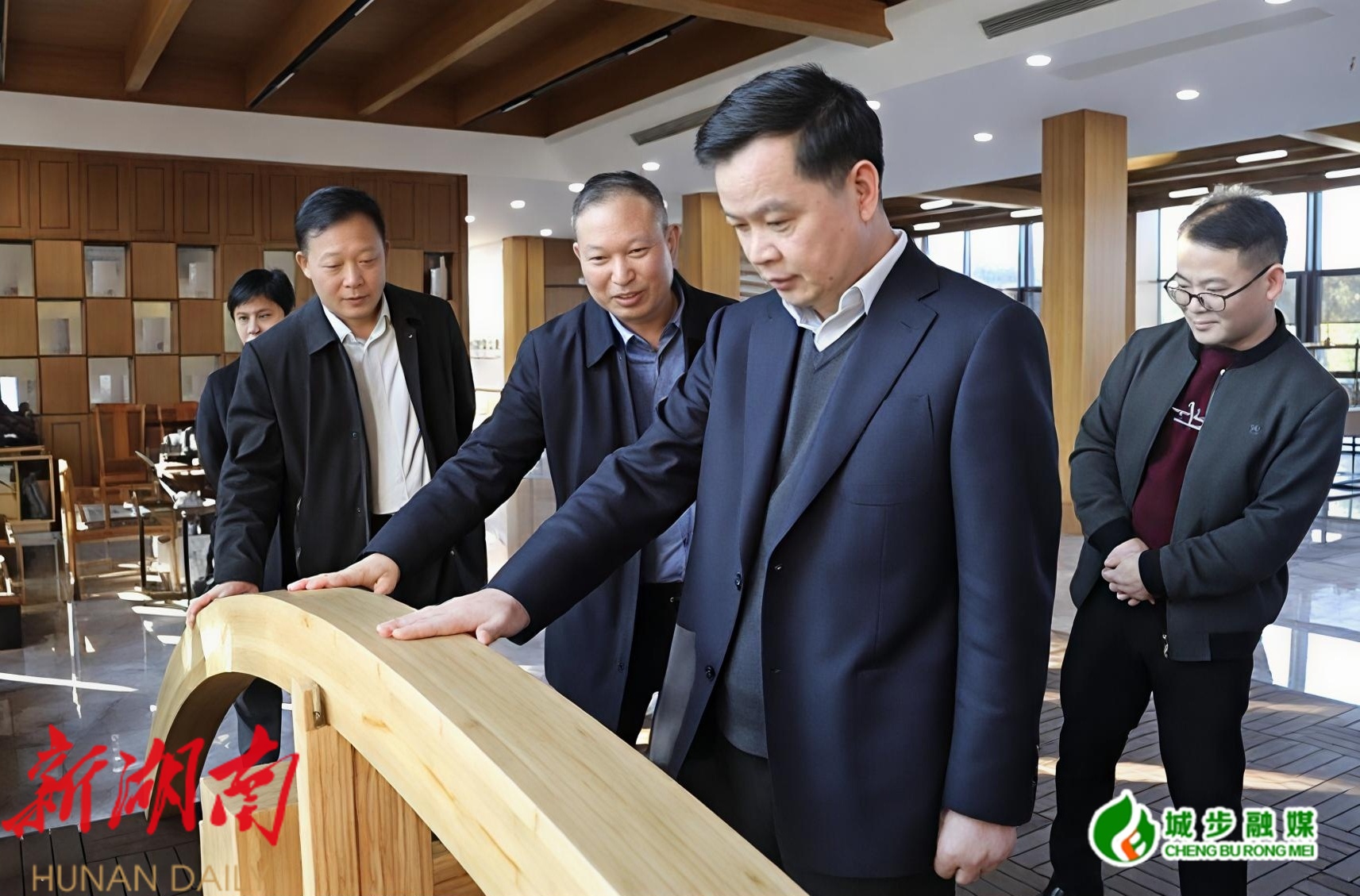 图为县委书记何德波一行在湖南桃花江竹材科技股份有限公司参观了解企业产品
