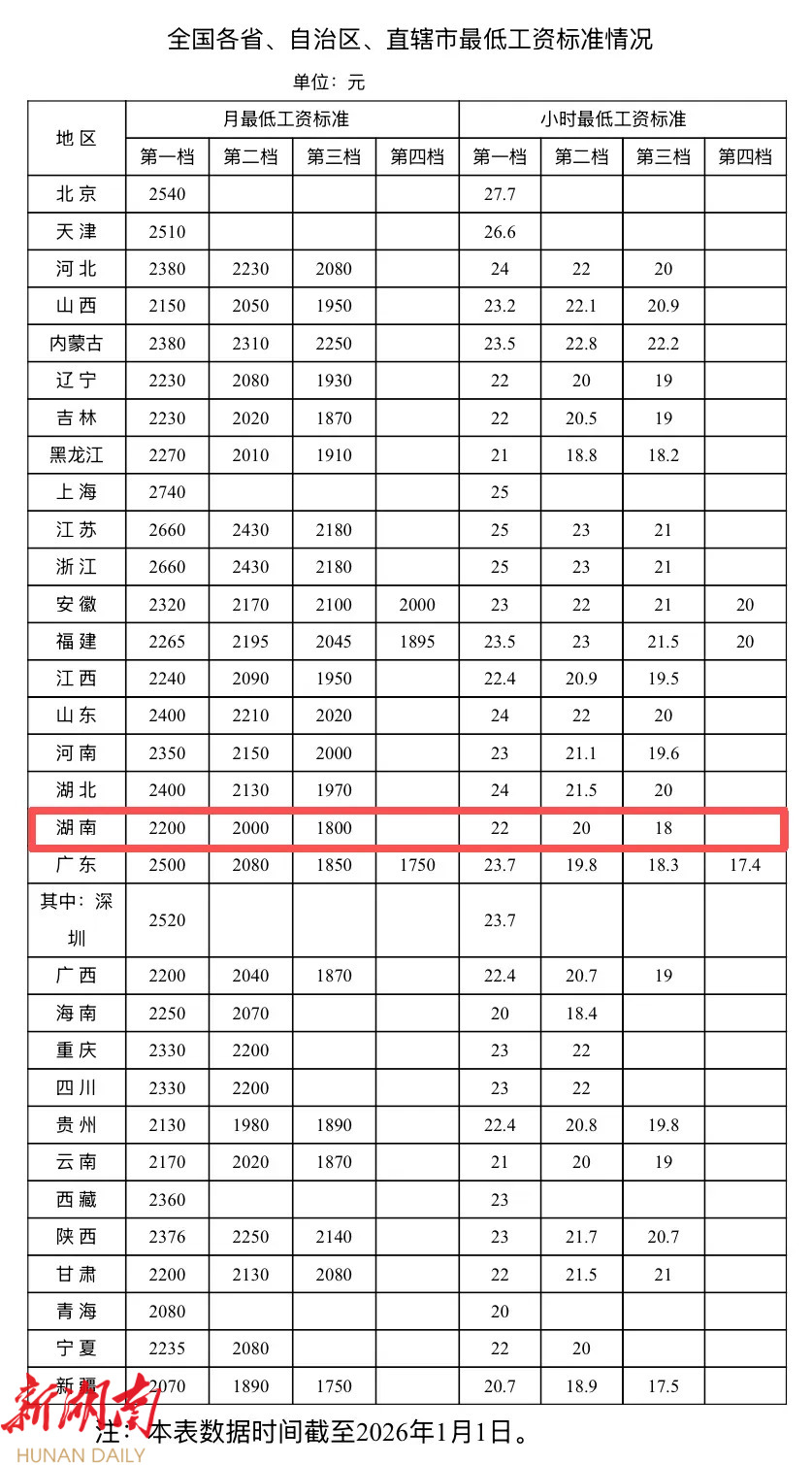 1月12日,中华人民共和国人力资源和社会保障部官网公布全国各省、自治区、直辖市最低工资标准情况(截至2026年1月1日)。