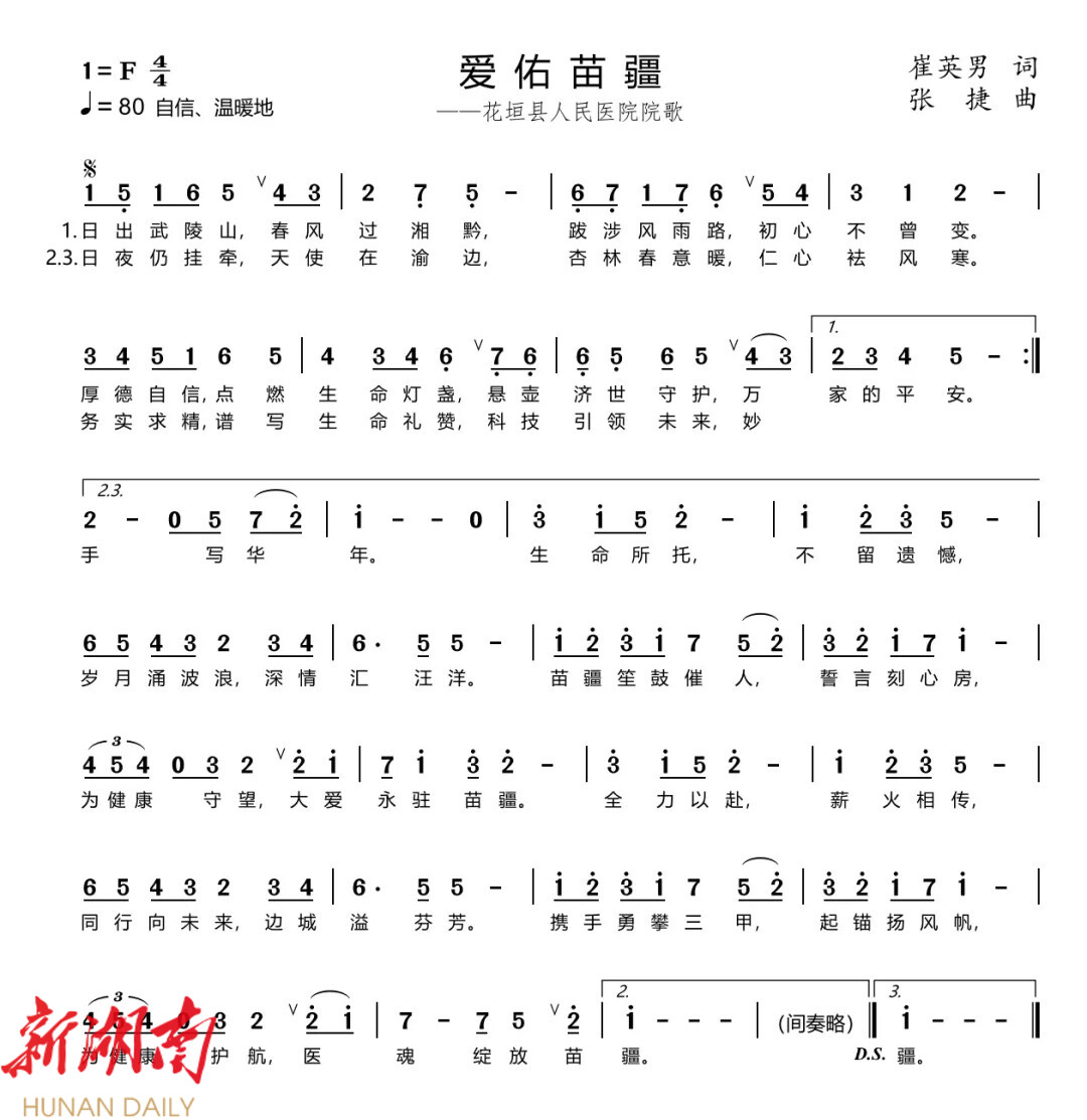 湖南日报·新湖南客户端1月14日讯(通讯员 陈慧群)花垣县人民医院于2025年4月启动院歌征集,得到社会各界热烈响应,累计收获156份诚挚创作。近日,经过严谨审慎的多轮评审,最终选定由崔英男作词、张捷作曲的原创作品——《爱佑苗疆》。这首院歌,不仅仅是一段动人的旋律,更是继院徽、院刊、院景、院训之后,又一深刻诠释该医院精神的有声诗篇,是凝聚医院灵魂的文化标签。