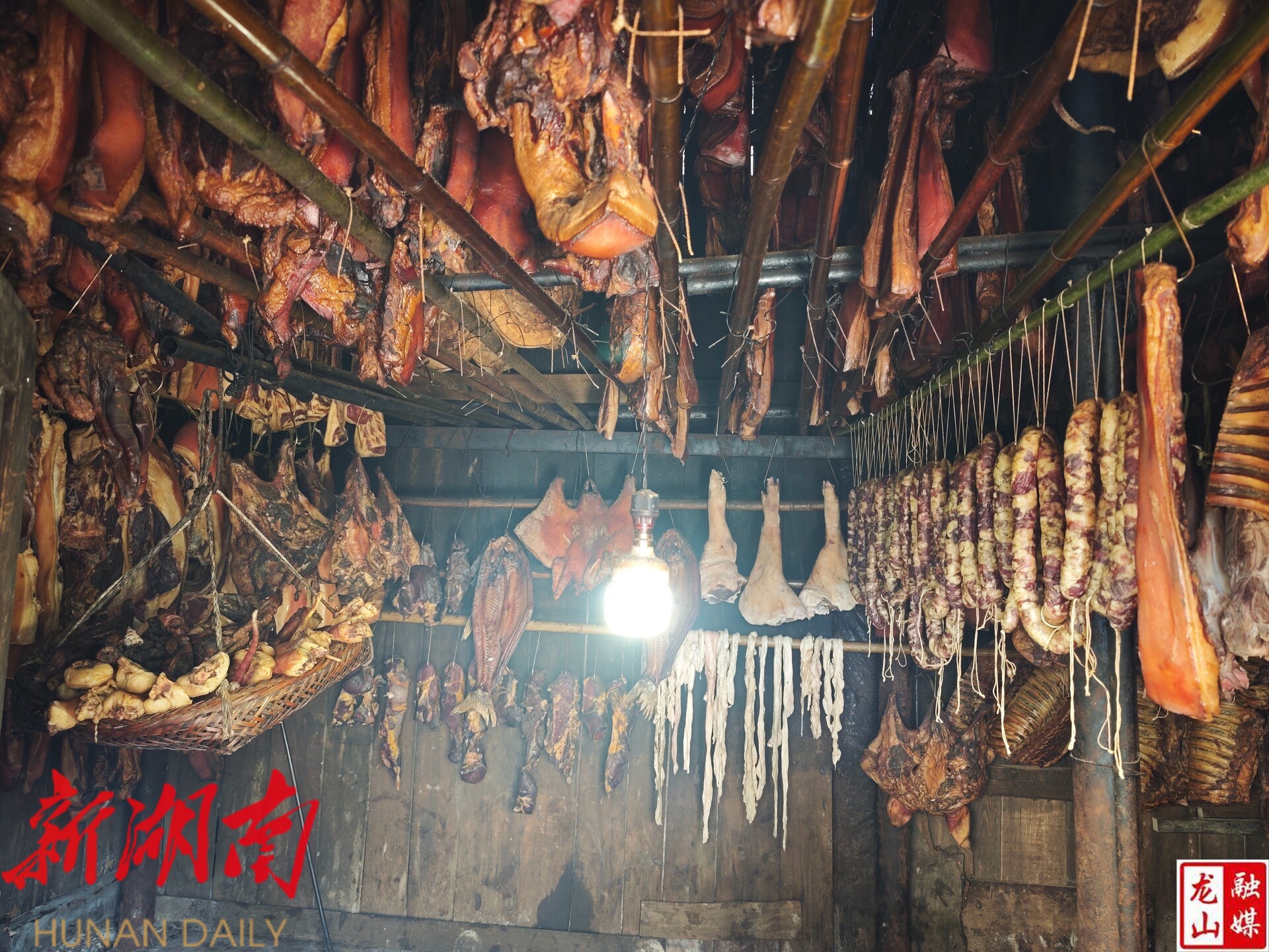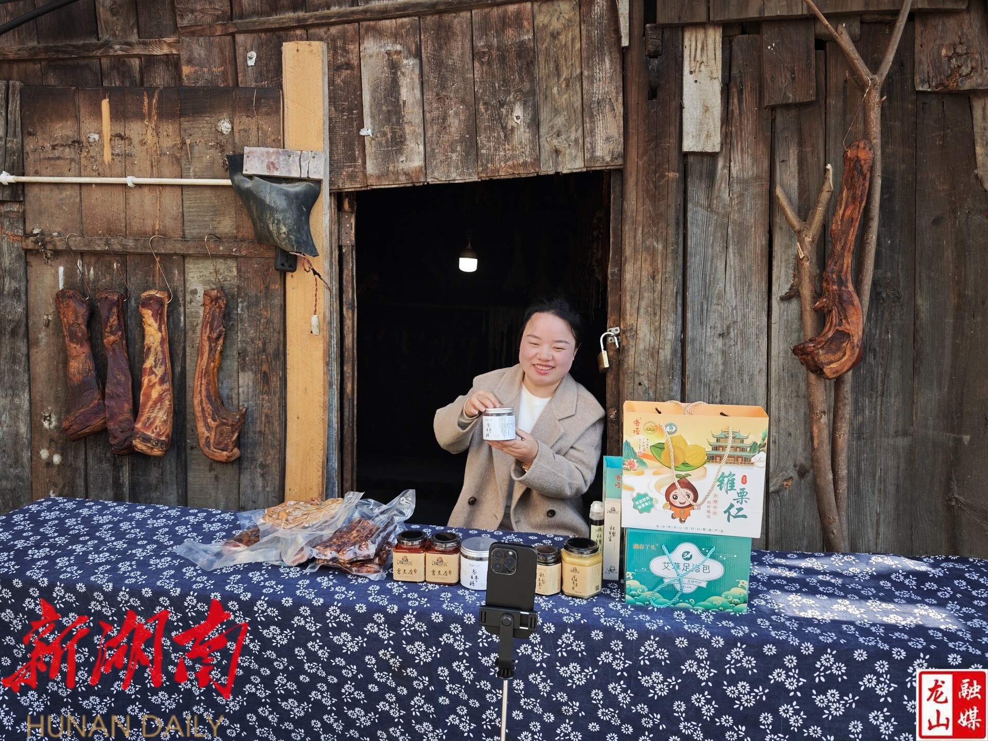 1月13日,龙山县天气晴好。吴添春在电商直播间里,认真介绍具有龙山特色的当下时令农产品腊肉、霉豆腐、秋梨膏、蜂蜜等,并从历史文化、地理优势、产业特色等多个方面进行了推介。她的背后,是腊肉的熏制现场,工作人员小心的走进熏制房,检查这一批腊味熏制的情况,并清点近日已经订购的猪脚、香肠。通过这一场直播,熏制房的腊制品销售额达到2万。