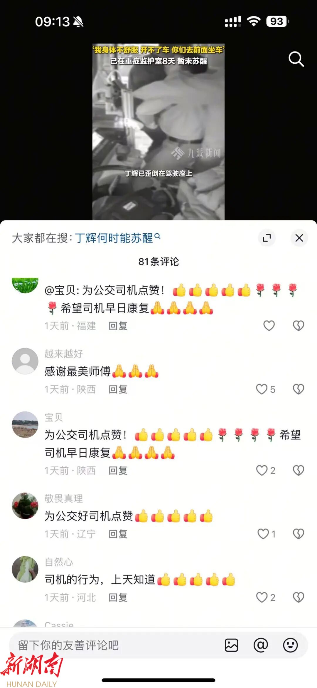 丁辉的事迹传开后,众多市民纷纷表达牵挂。常坐5路公交的市民刘女士说:“我每次去城里就要坐5路车,这个师傅是个有耐心的,特别暖心的人,希望他能早日康复。”还有市民自发到公交公司打听情况,网络上更是满屏祝福,不少人留言祝愿丁师傅早日脱离危险,平平安安,大家都期待着这位暖心司机能早日回到岗位上。