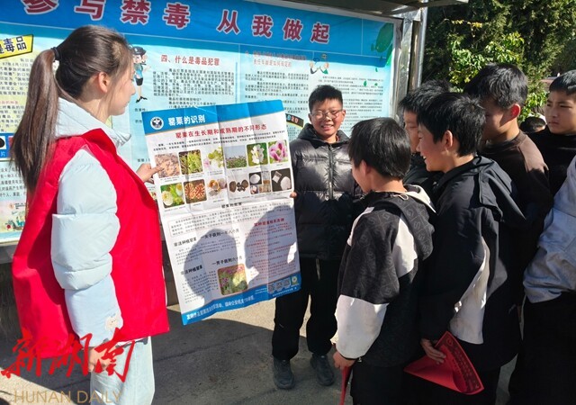 湖南日报·新湖南客户端1月1 5 日讯(通讯员 龚端翔 ) 1月13日,新化县坐石乡、维山乡等乡镇禁毒办联合司法所及禁毒志愿者走进学校,开展了内容丰富、形式多样的禁种铲毒宣传活动,为在校师生带来了一堂生动的“禁毒课”。