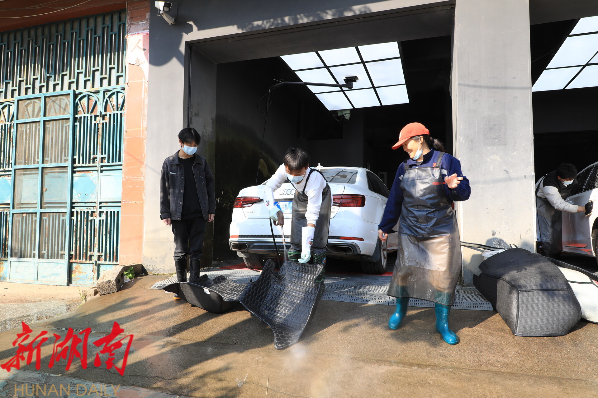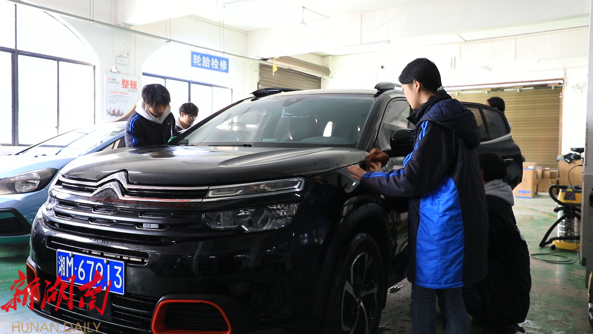 在江永县洗之郎汽车私人订制服务点内,专业技师指导职中学生进行高压水枪冲洗、洗车液精细擦洗、内饰除尘养护的标准化流程作业,每个步骤都有条不紊,不到二十分钟,车辆便焕然一新。