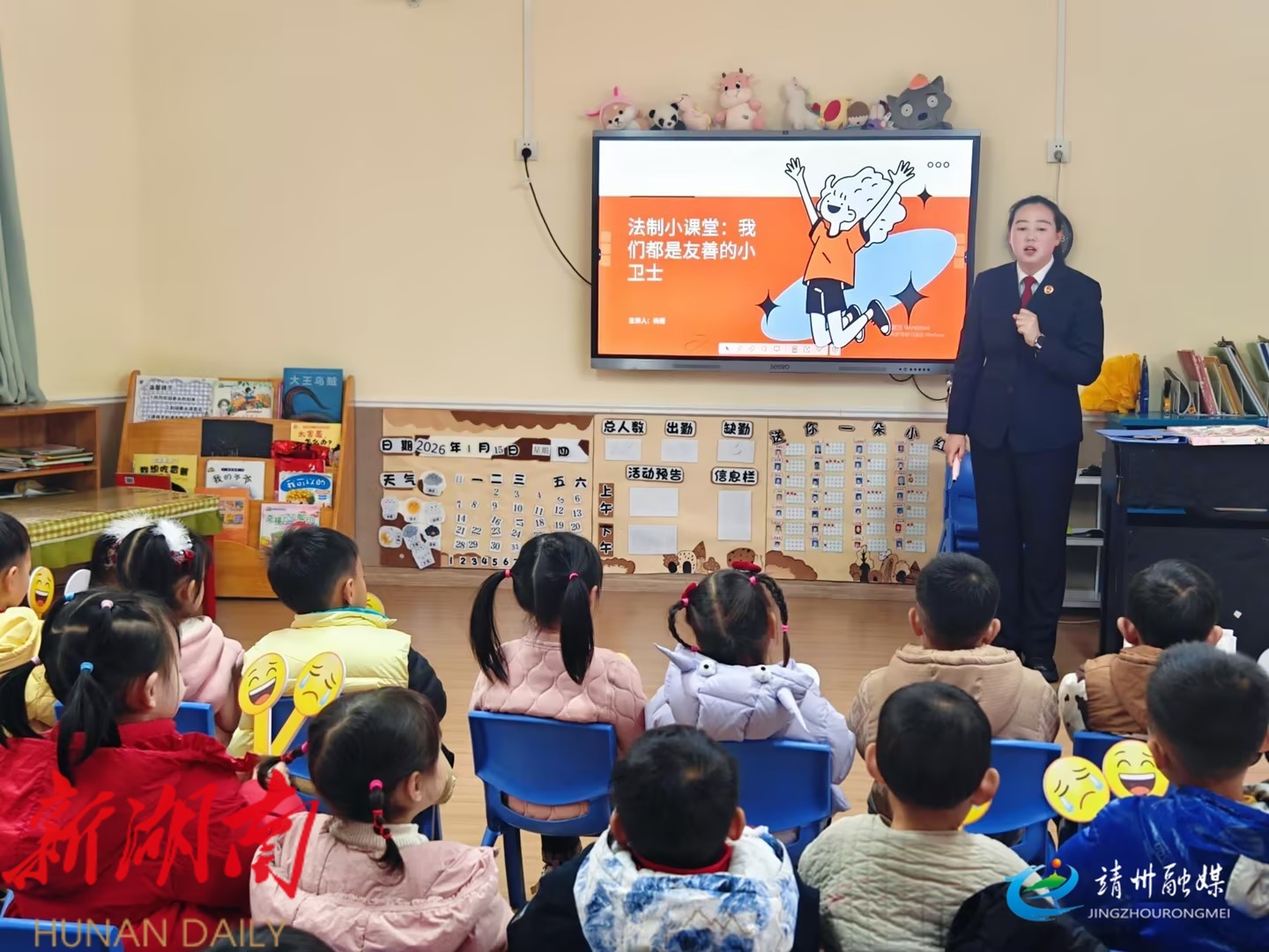 靖州融媒1月15日讯 (陈琴燕 龙淑娟)1月15日,靖州苗族侗族自治县幼儿园开展家长助教活动,邀请检察官家长志愿者杨珊走进课堂,为幼儿们带来一堂生动的防欺凌安全教育课。