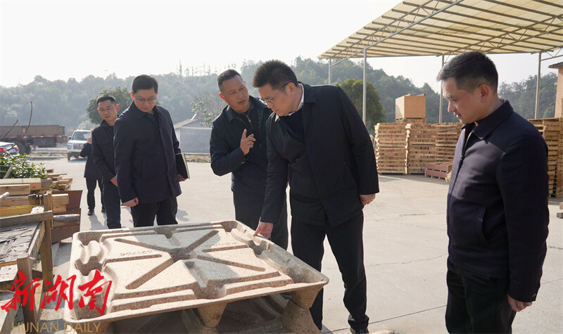 返乡创业是激活乡村活力、助推县域经济发展的重要引擎。在筻口镇岳阳梓洋木业有限公司,自动化生产线将水稻、玉米等农作物秸秆烘干粉碎后,经标准化流程加工成环保模压托盘,广泛应用于物流、化工等领域,实现“变废为宝”。该产品契合新质生产力发展要求,市场前景广阔。公司一、二期投资2000万元,目前,一期已完工且产销两旺;第二期设备正在制造中,预计明年3月份可安装完成;三期计划投资4000万元,全部建成后年产值将超2亿元,年消耗秸秆8万吨。肖湘晖详细询问产品销路、技术研发等情况,对企业践行绿色循环经济的实践给予高度评价,他强调,相关部门要主动靠前服务,强化政策与要素保障;企业要坚定投资发展信心,坚守规范生产底线,深耕自动化高新领域,将绿色环保理念贯穿生产全流程。