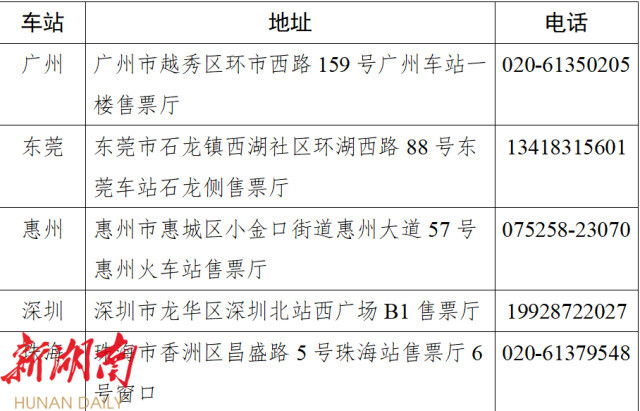 针对珠三角地区大型务工企业的集中出行需求,国铁广州局专设5个线下服务点受理包车厢、包列业务,全程专人对接保障。1月18日至1月30日,每日8:00-12:00,14:00-17:30期间,珠三角地区用工规模不少于300人的务工企业可于开车前20天到广州、深圳、东莞、惠州、珠海五个车站的专项办理窗口,现场办理同一日期、车次、方向、席别的300人及以上的包车厢、包列团体订票业务。订票时,具体可办理2月6日至2月14日广东地区始发、2月21日至2月28日湖南地区始发的部分列车。