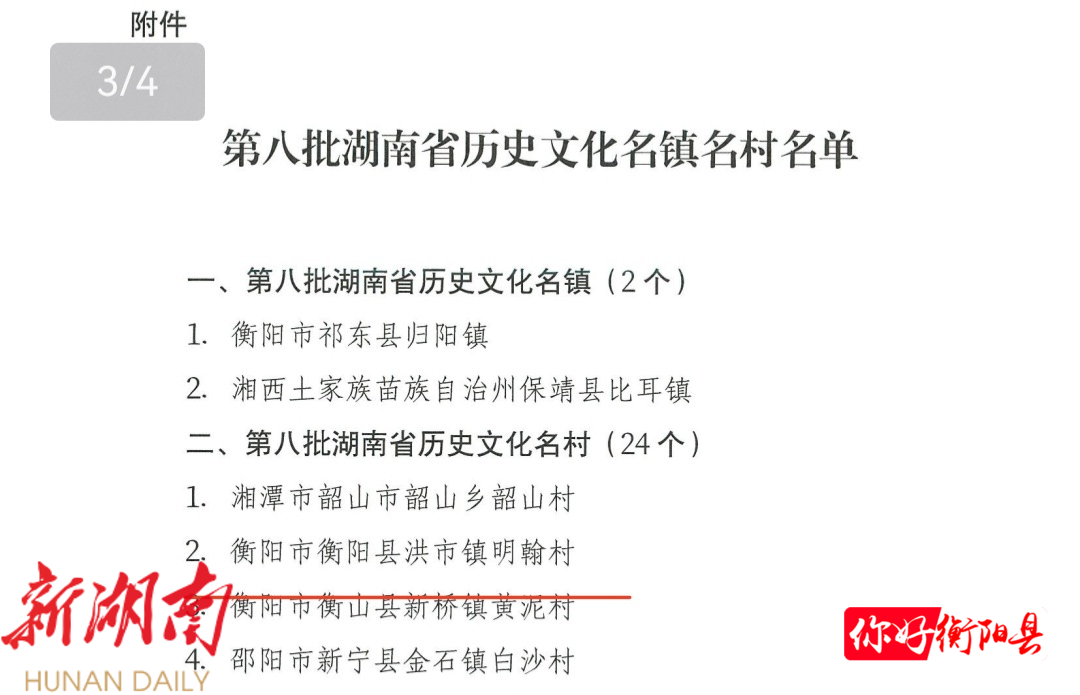 衡阳县融媒1月16日讯(通讯员:陈曙霞 刘小军 申亿文) 近日,湖南省人民政府正式批准公布第八批湖南省历史文化名镇名村名单,衡阳县洪市镇明翰村凭借其深厚的红色底蕴、丰富的历史遗存和完整的传统格局成功入选。此次全省共公布名镇名村26个,明翰村是衡阳县本批次唯一入选的村落,标志着该村在历史文化保护与传承方面迈上新台阶。