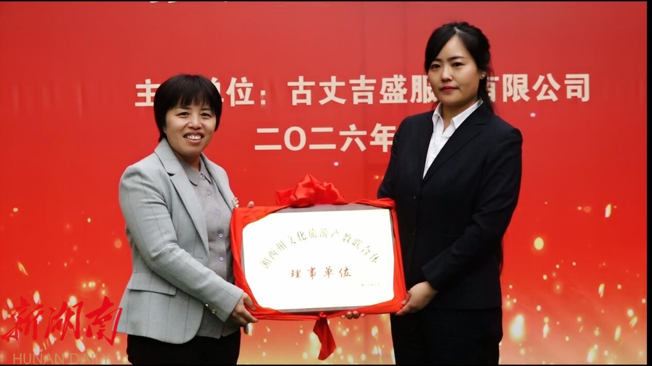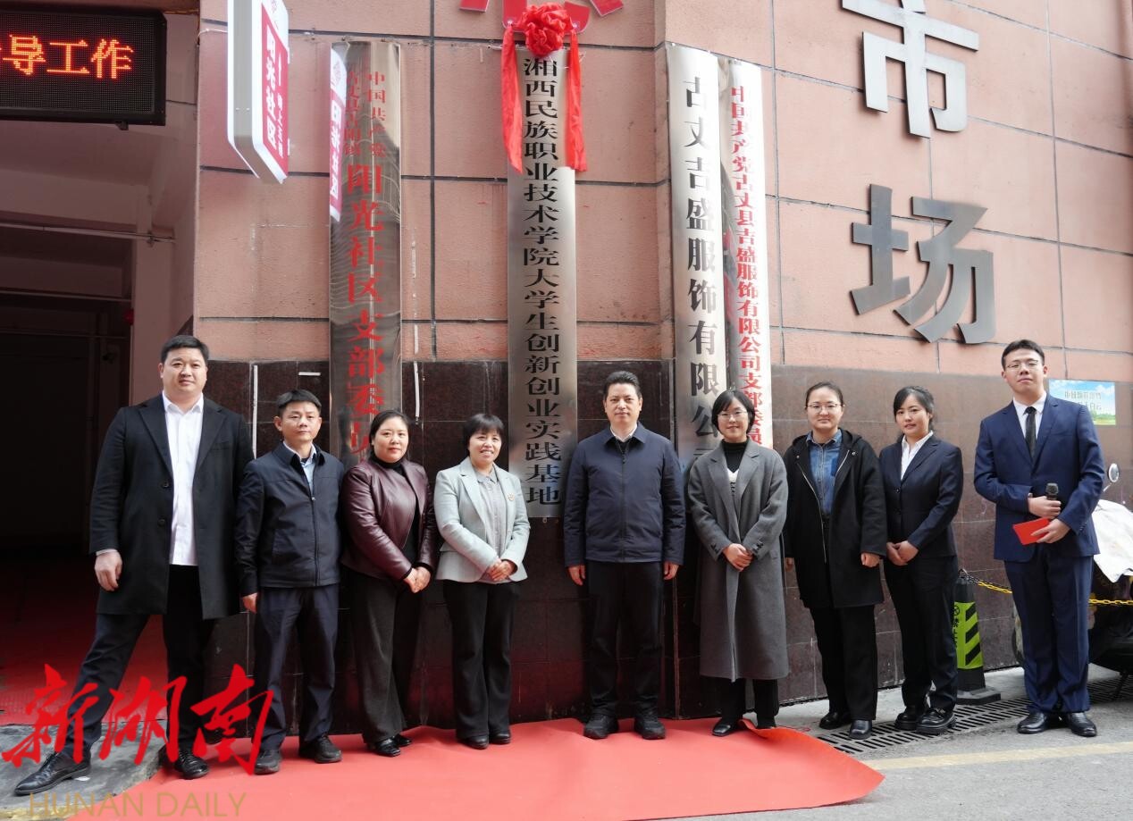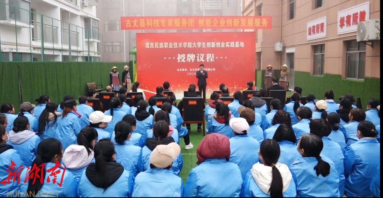 仪式上,滕朝辉与吴娟共同为“大学生创新创业实践基地”揭牌 。 吴娟代表湘西职院向吉盛服饰授予“湘西州文化旅游产教联合体理事单位”牌匾,标志着政企校三方合作正式 启动 。