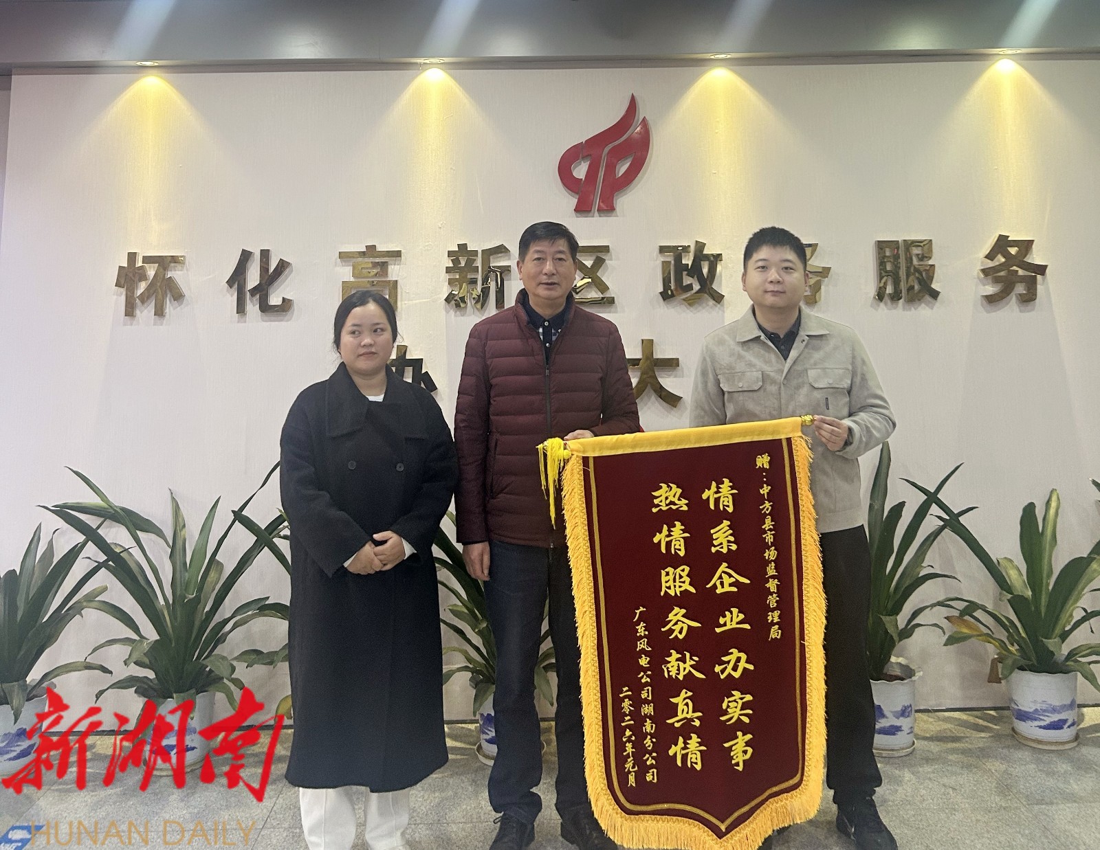 中方融媒1月17日讯 (通讯员:刘永华)1月15日,一面印着“情系企业办实事 热情服务献真情”的锦旗被送到怀化高新区政务服务中心,这是广东省风力发电有限公司对中方县市场监督管理局优质服务的诚挚赞许。
