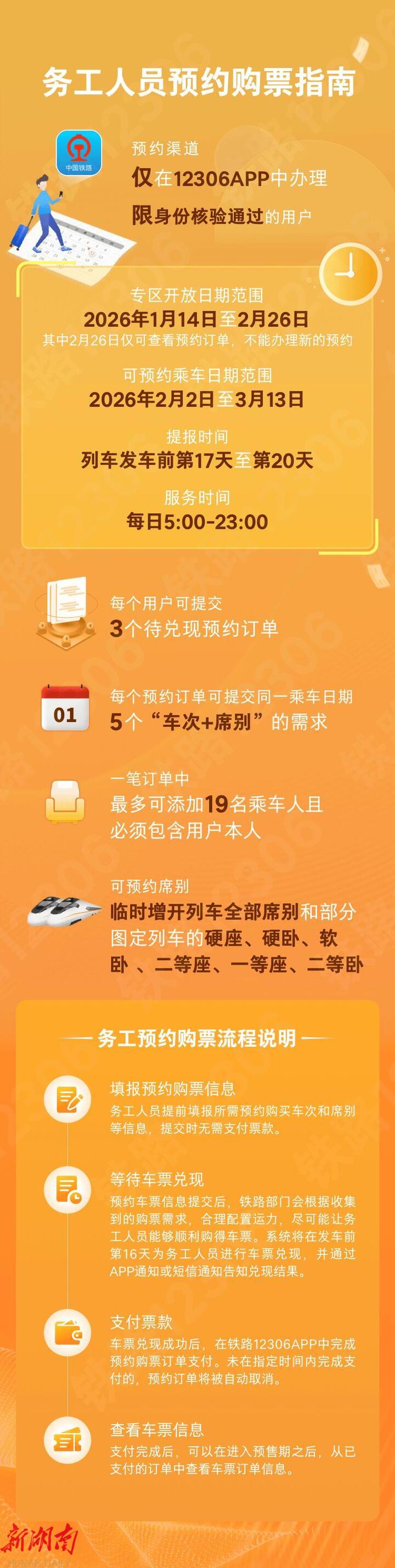 2026年春运,铁路12306继续推出务工人员预约购票专区服务。现在起到2月26日,已通过实名制核验的务工人员可预约购买2月2日至3月13日的火车票。