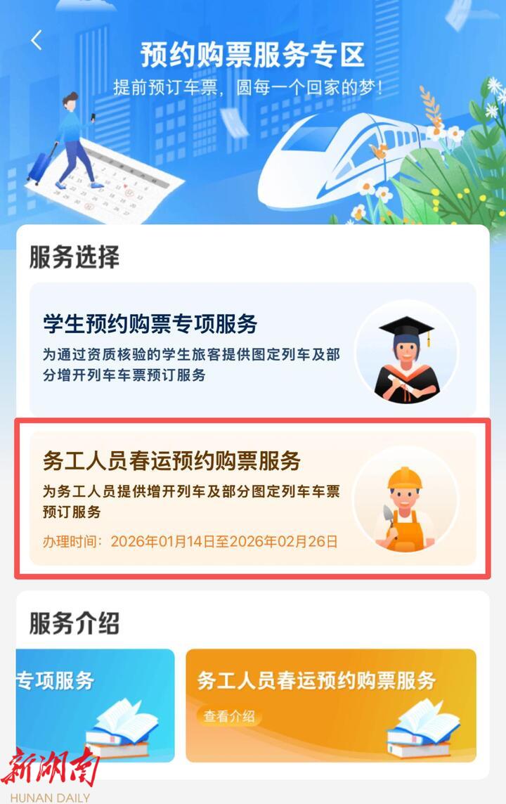 记者今天(17日)从国铁集团客运中心了解到,铁路12306手机客户端务工人员预约购票服务目前已上线,符合条件的务工人员可线上预约购买2026年春运期间往返车票。