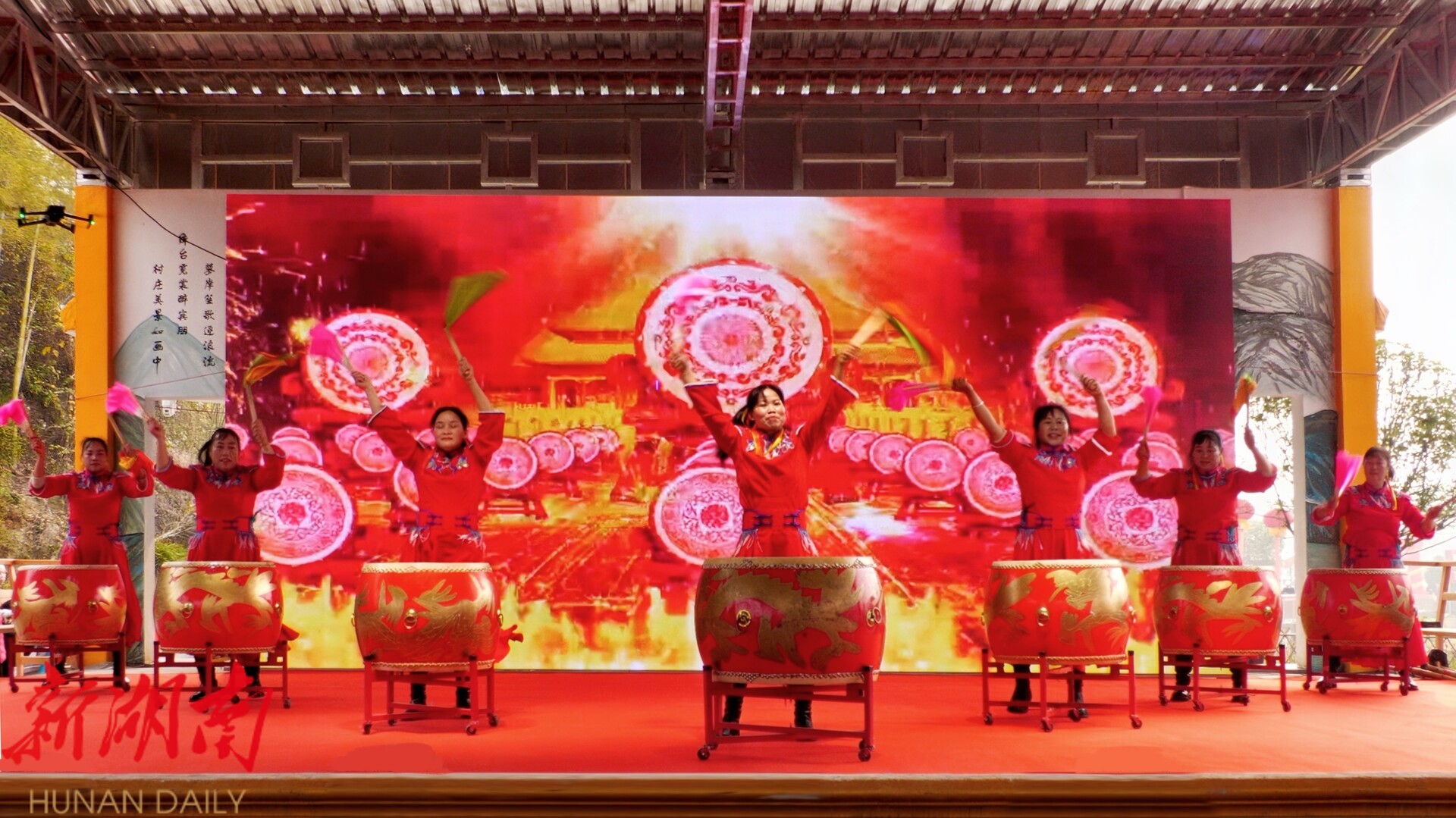 汇演现场,石榴村鼓舞队与村民接连登台,带来一场充满乡音乡情的文化盛宴:鼓舞《喜庆年》拉开序幕;经典花鼓戏《打铜锣》、情景剧《刘海砍樵》再现乡土记忆;村歌《石榴红》唱出深情告白,现代舞展现青春风采;网红“徐姐”登台分享暖心故事,引发全场共鸣。台上倾情演绎,台下掌声不断,气氛热烈。