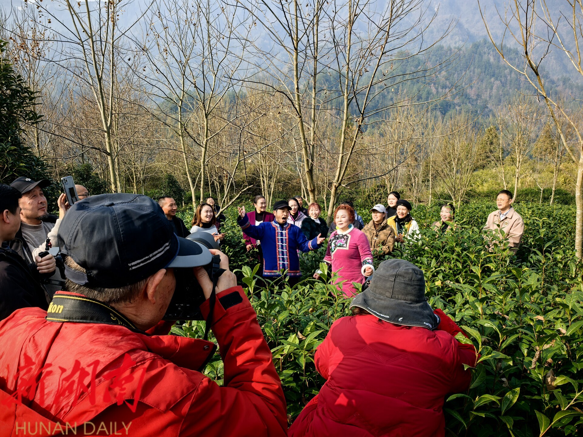 茶园里,茶树在冬日依旧整齐挺立,长势喜人,绿意盎然,展现出蓬勃生机。活动中,摄影家们用镜头捕捉茶山的层叠线条与静谧之美;桑植民歌国家级非遗传承人尚生武等文艺家则在茶园中即兴唱起了悠扬的桑植民歌。歌声吸引了众人,大家自发围聚,共同唱响乡音,现场气氛热烈融洽,艺术与自然生动交融。