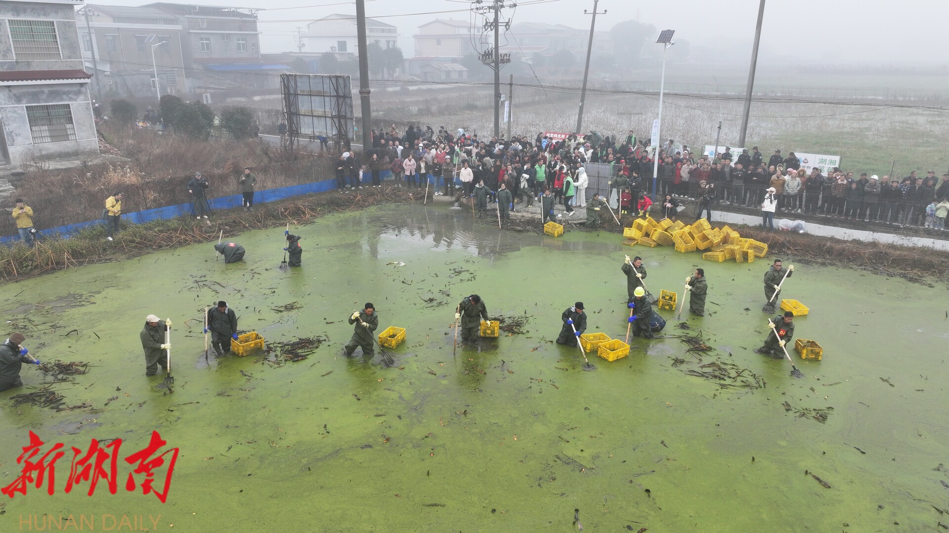 湖南日报·新湖南客户端1月18日讯(通讯员 苏扬 蒋龙 黄家睿)1月18日,湘阴县鹤龙湖镇古潭村千亩藕塘内人声鼎沸、暖意融融。500余名来自全国各地的游客、网红达人与当地村民欢聚一堂,一场别开生面的生态甲鱼捕捞比赛在此热闹上演,以趣味劳动为农户纾困解难,为乡村振兴注入鲜活动能。