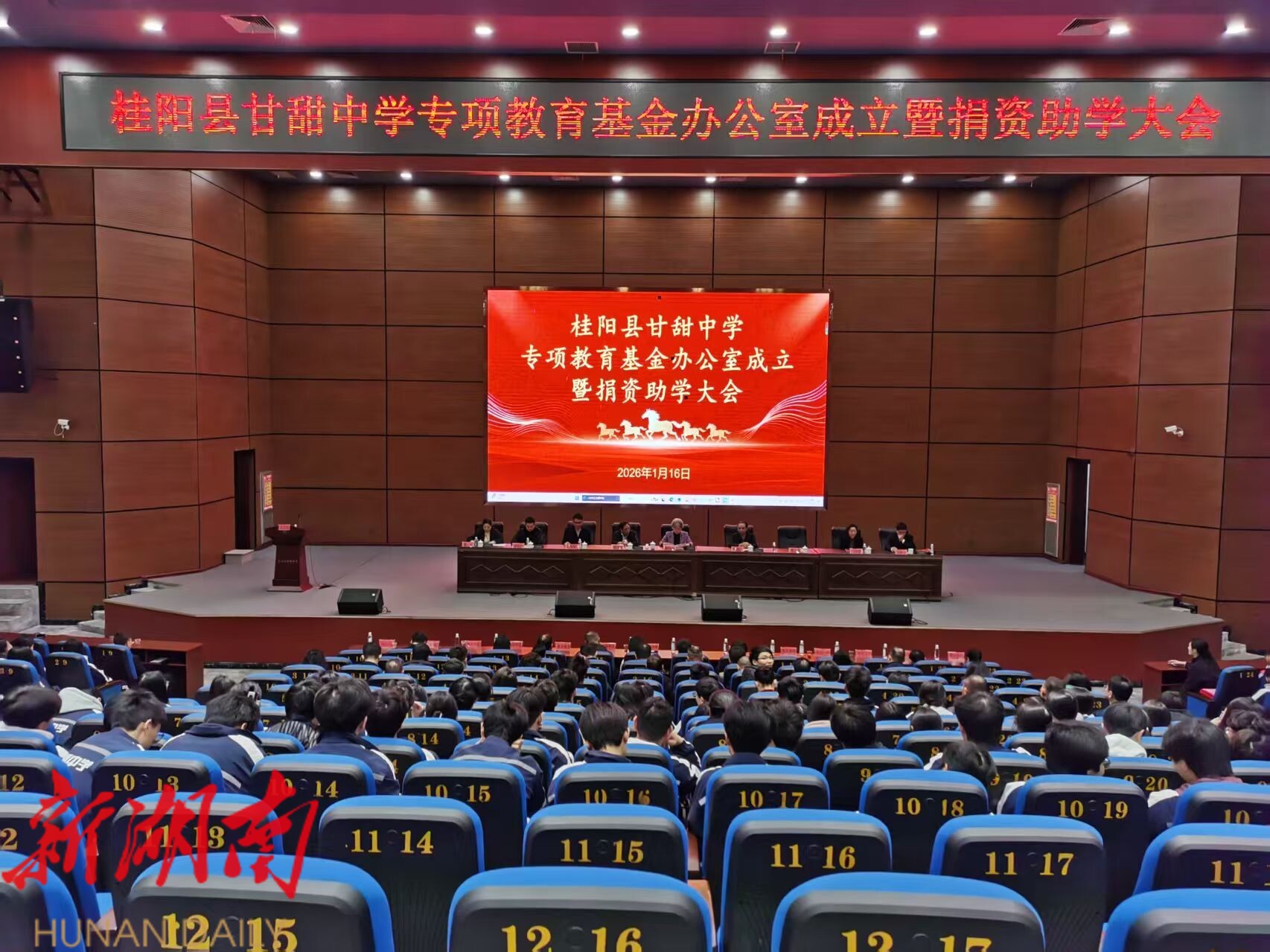 新桂阳1月19日讯(记者 邓超玮 )1月16日,甘甜中学专项教育基金办公室成立暨捐资助学大会召开。