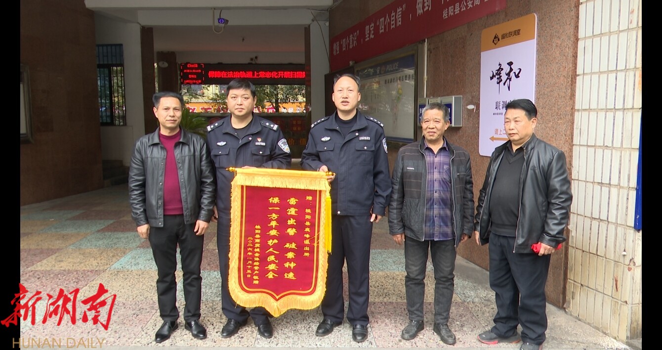 新桂阳1月19日讯(记者 李玮嘉 刘克坚 )1月16日,桂阳商贸城全体经营户 代表 ,将一面印着“雷霆出警 破案神速 保一方平安 护人民安全”的锦旗送到县公安局鹿峰派出所,感谢民警快速破获系列盗窃案。