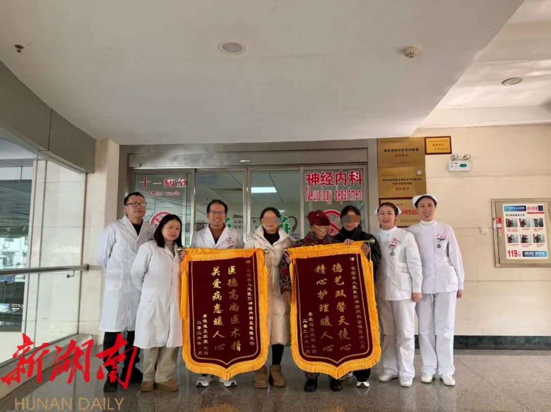 湖南日报·新湖南客户端1月19日讯(通讯员 陈慧群 罗典)两面锦旗,一份深情厚谊。近日,花垣县人民医院神经内科医护办公室里,85岁的五保户老人李连妹(化名)在亲属陪同下,亲手将两面锦旗交到医护人员手中。锦旗上书:“医德高尚医术精,关爱病患暖人心”“德艺双馨天使心,精心护理暖人心”。质朴的文字背后,是一段温馨而动人的救治故事。