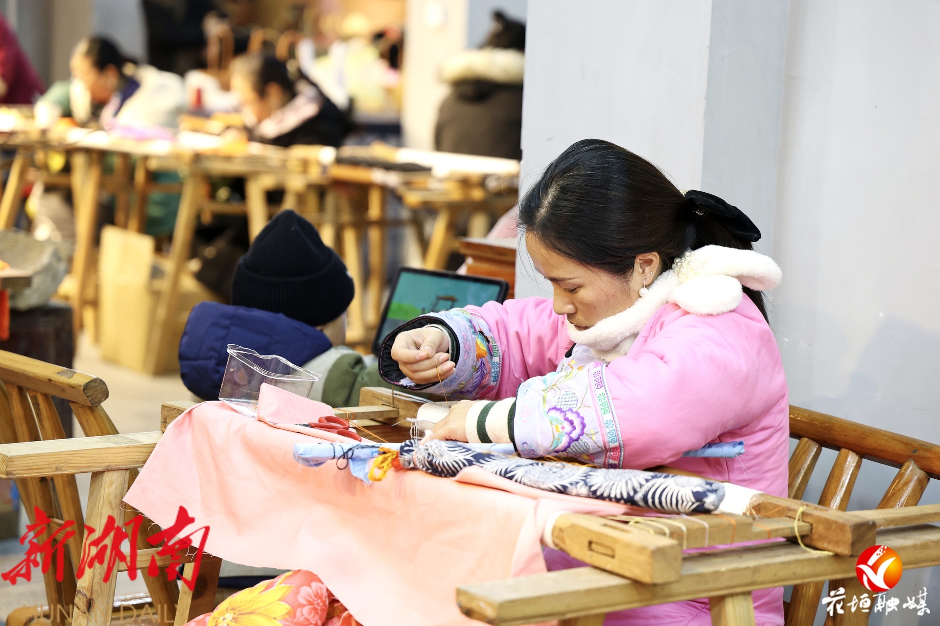 绣花、带娃两不误