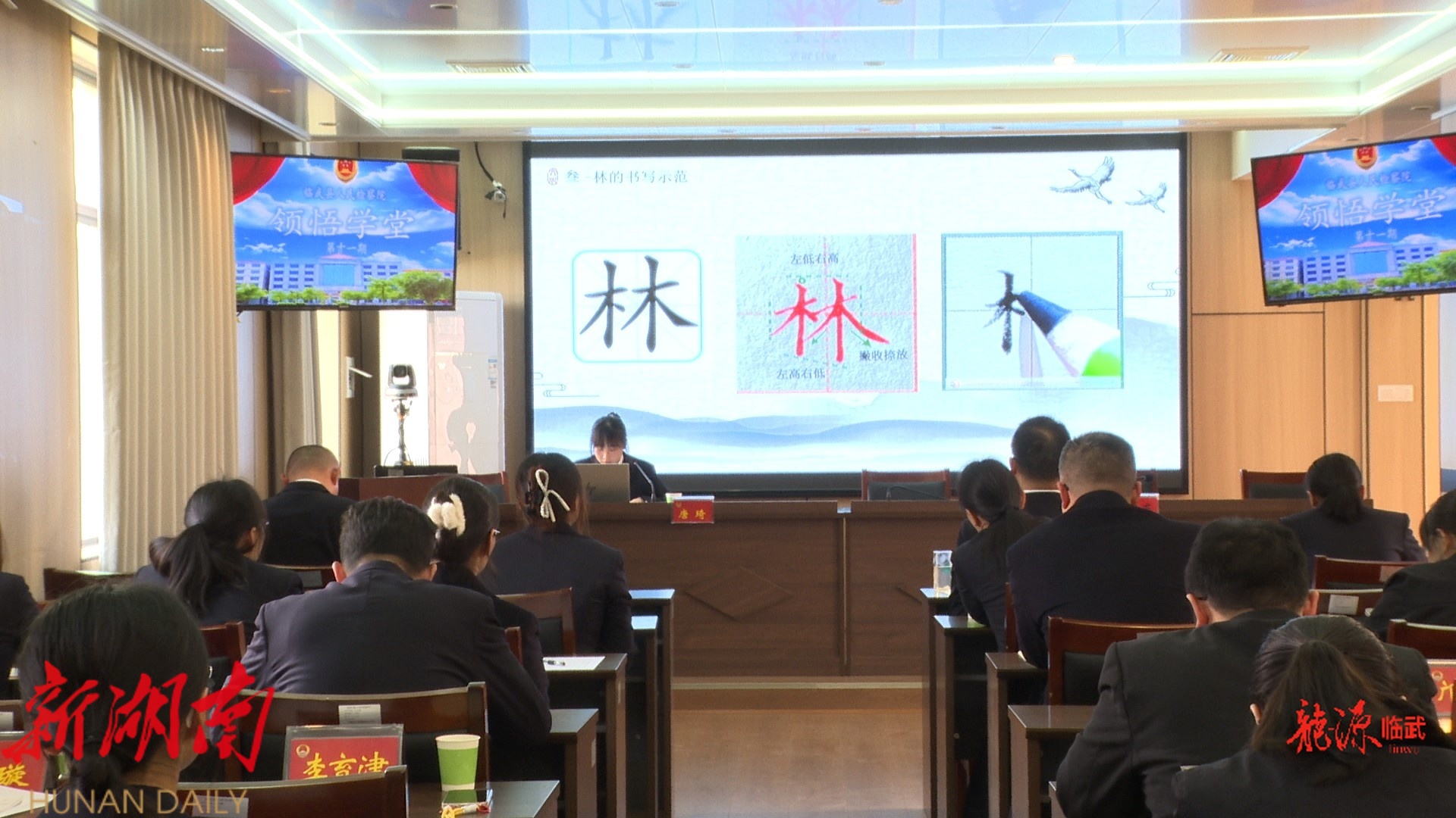 在临武县人民检察院,书记员唐琦正在为大家讲解硬笔楷书的书写技巧与文化内涵。干警们提笔练习,在感受传统文化的同时,也舒缓了工作压力。