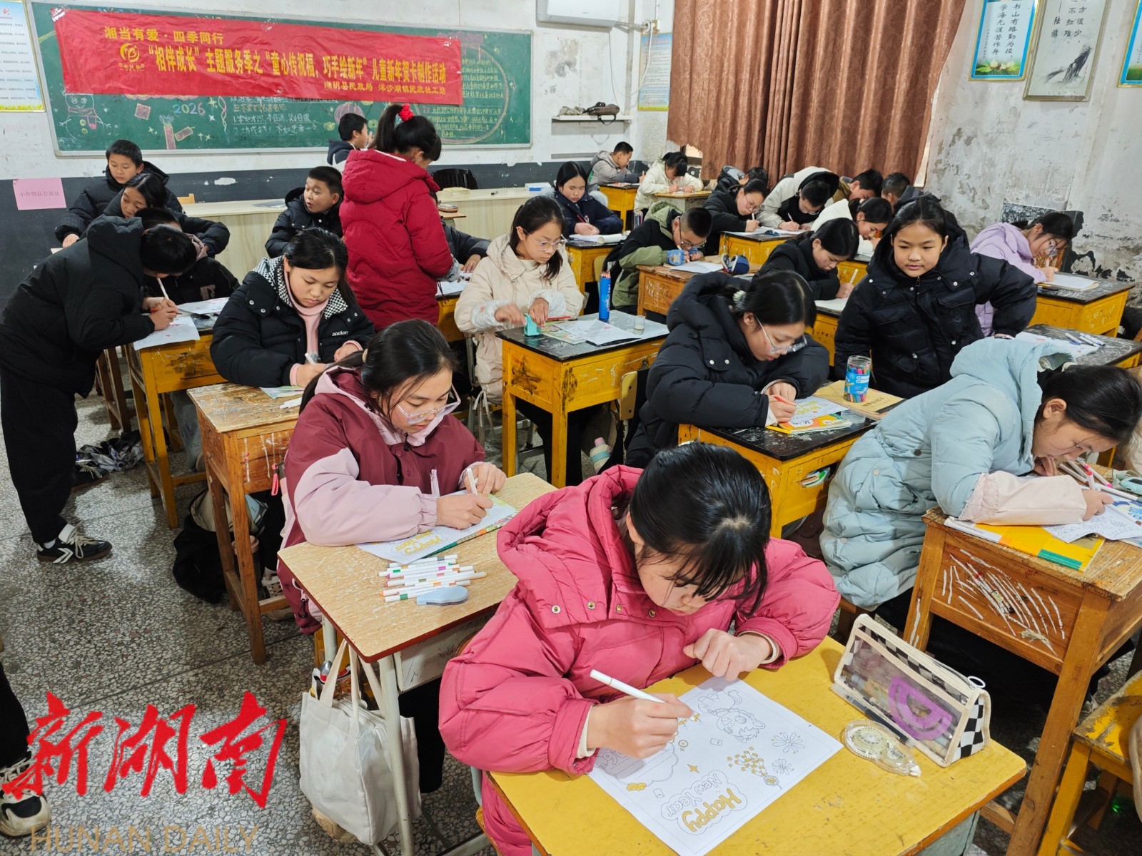 湖南日报·新湖南客户端1月20日讯(通讯员 徐一涵)为传承中华传统祝福文化,培育辖区青少年感恩亲情的美好品德,1月19日,湘阴县洋沙湖镇团委联合镇社工站走进袁家铺中学,精心组织开展“童心传祝福”爱心贺卡制作活动,引导同学们在创意挥洒中寄托深情,以多元形式为家人送上新春暖意。