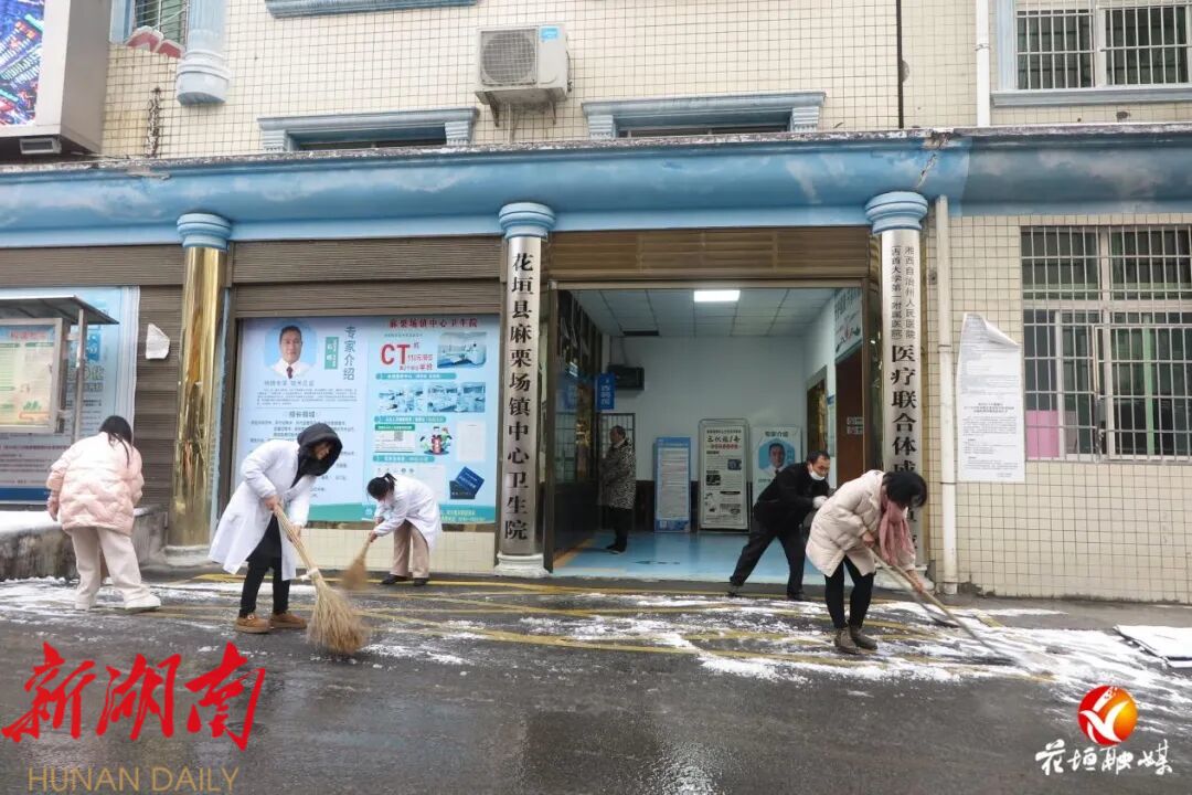 麻栗场镇中心卫生院医务人员清扫院内冰雪,保障患者安全就医 麻栗场镇卫生院供图