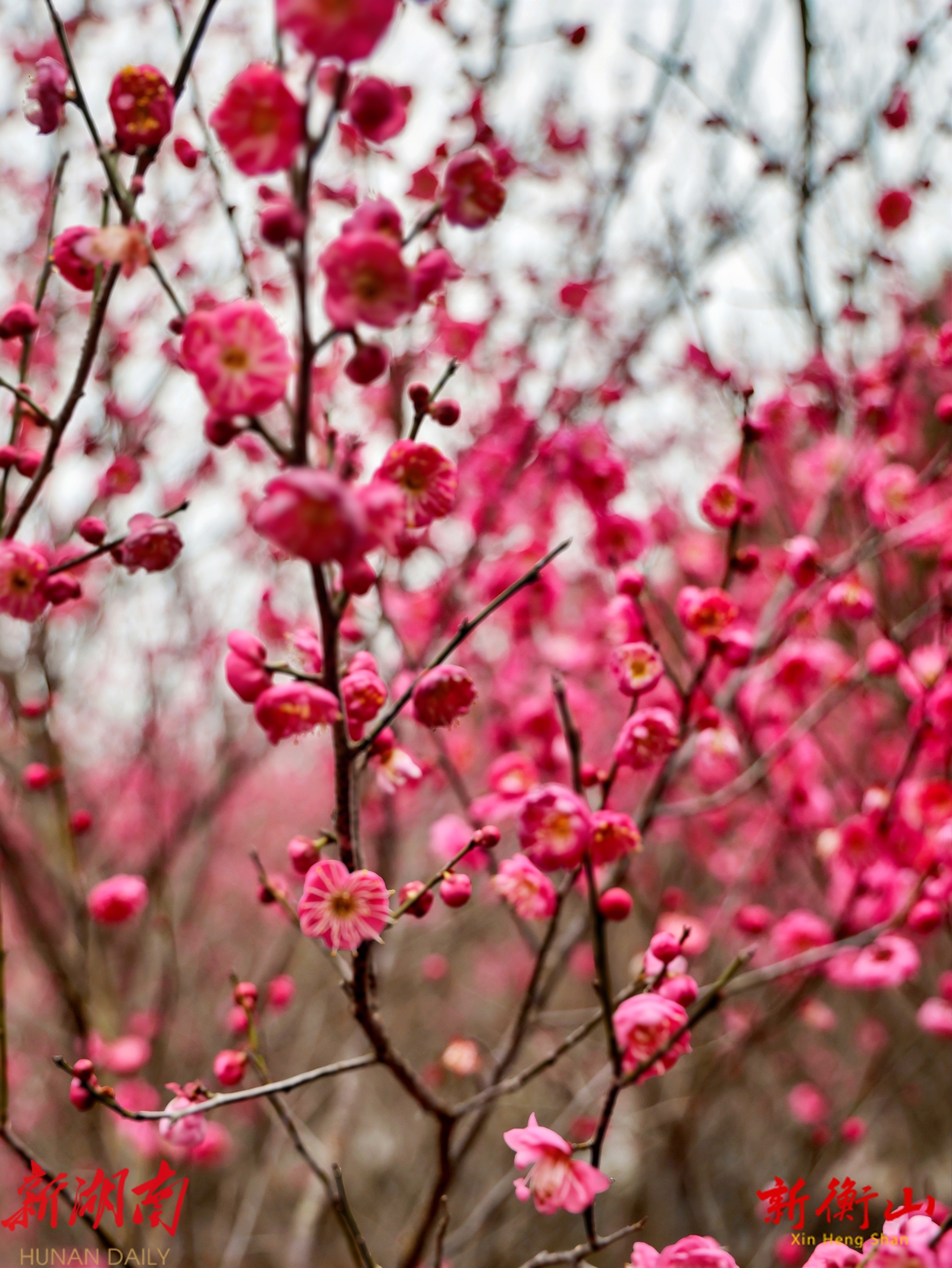 2026年1月18日,大寒节气前一天,衡山县新桥镇黄泥村唐群英故居前的梅苑,两百余株梅花渐次盛开,引来远方游客打卡赏梅。