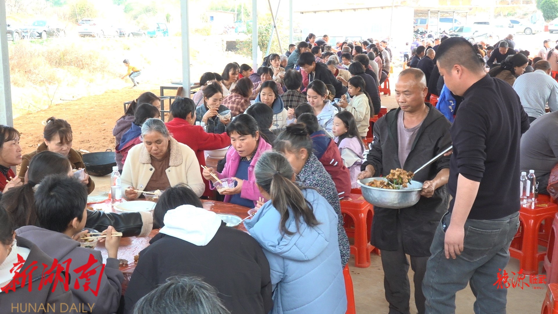 随着回锅肉、猪杂汤、时令小菜等家常菜肴陆续上桌,这场汇聚了500多人的年猪饭正式开席,来自广州、郴州周边的游客与本地乡亲围坐一堂,脸上都洋溢着欢喜的笑容。大家一边品尝美食,一边拉着家常,聊聊过去的年味回忆,说说新一年的美好期盼,碰杯声、谈笑声、孩童的嬉闹声交织在一起,汇成了最动人的年俗乐章,每一个瞬间都充满了团圆的温情与烟火的暖意。