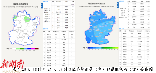 20日08时至21日08时,全县部分地区出现小雨或冻雨。共有2站降雨,最大降水0.2毫米(镇南乡镇南站);国家气象站气温降至-1.1度,全县35区域气象站气温均达到0度以下,最低-6.5度(西瑶乡分水坳站,海拔高度1073米)。