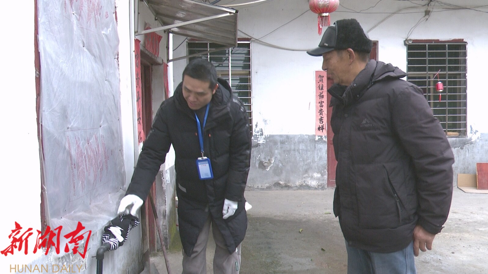 在碧塘村一村民家中,工作人员仔细检查供水管线的易冻部位,对户外裸露管道进行缠绕包裹,对老旧供水设施进行检查处理,并向村民详细讲解冬季水管防冻常识与应急处理方法。