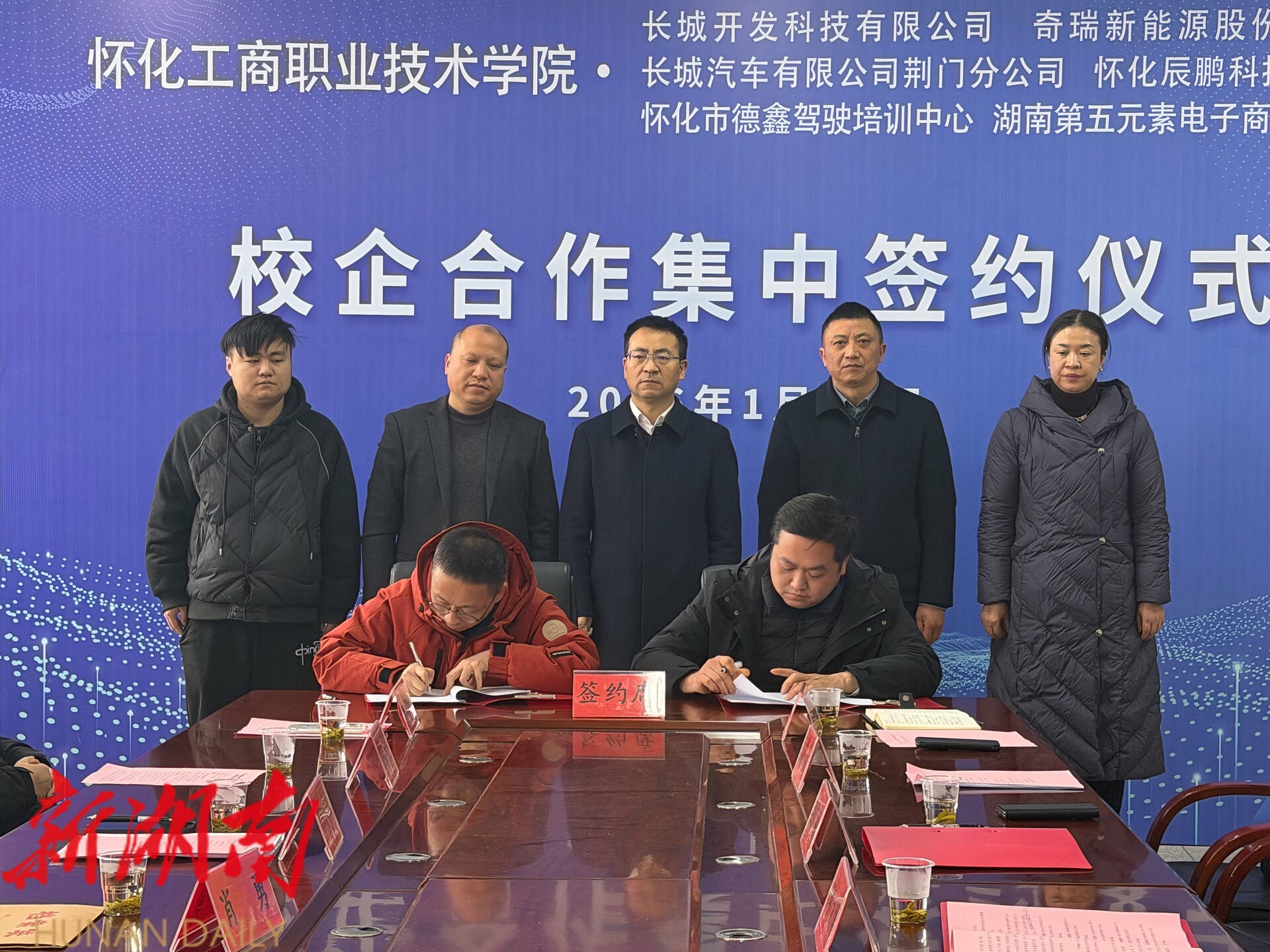 随后, 怀化工商职业技术学院代表分别与长城开发科技有限公司、奇瑞新能源股份有限公司、长城汽车有限公司荆门分公司、怀化辰鹏科技有限公司、怀化第五元素、怀化德鑫驾校等6家企业代表签订合作协议。