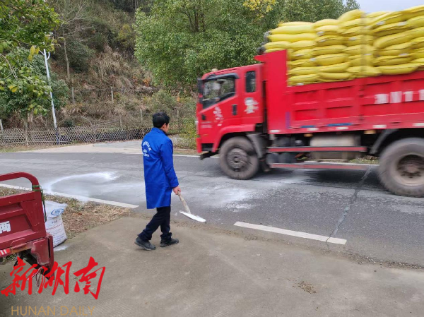 闻“雪”而动,全力保障道路畅通。桐木镇第一时间组建由镇村干部、党员志愿者、应急抢险队员组成的专项队伍,实行24小时道路巡查值守制度,对镇内主干道、乡村公路、桥梁陡坡、学校医院周边等重点路段开展拉网式巡查,实时掌握路面结冰、积雪情况。针对易结冰路段,工作人员手持铁锹精准播撒工业盐加速融冰,确保积雪结冰及时清除。同时,在急弯、陡坡、临水临崖等危险路段规范设置“路面结冰”“减速慢行”等警示标牌30余块,交通劝导员按照“七必上”原则,上路开展劝导引导车辆通行,切实做到“雪不停、人不歇,路不净、不撤岗”,全力保障群众出行安全。