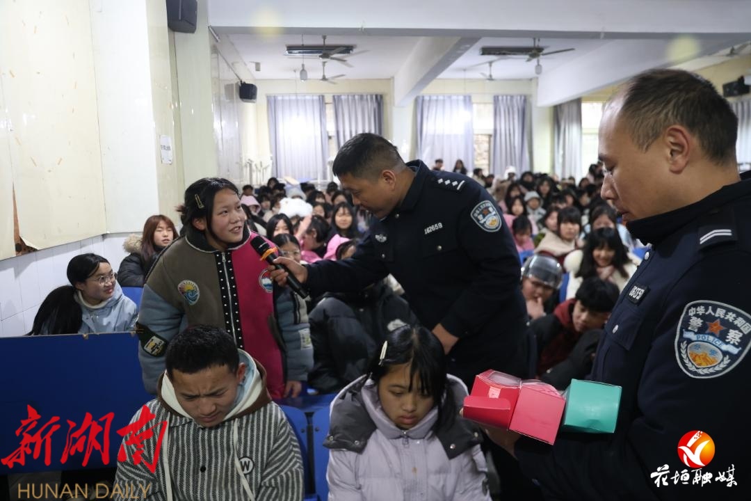 今天上午,花垣县双龙镇董马库九年一贯制学校的阶梯教室气氛热烈。寒假前夕,花垣县公安局十八洞派出所联合刑侦反诈中心、交通管理大队走进校园,为近300名初中学生带来了一堂沉浸式“三防”(防诈骗、防校园欺凌、防交通事故)安全教育课。