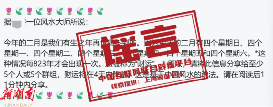 真相: 这些言论是典型的网络谣言。平年的2月都有28天,正好是4个完整的星期,这28天里必然包含4个周一、4个周二……直到4个周日。不用间隔823年,任何一个平年,都符合网传信息所谓的“特殊”要求。可见,“特殊月份”压根不特殊,“823年才能遇到一次”更是无稽之谈,与财运等迷信说法无关。类似谣言不是第一次出现,每隔数年就有一个新版本,其实是把常见的历法现象包装成难得一遇的情况,再通过“转发获财运”等诱导话术传播,实现网络营销。(来源:“上海网络辟谣”微信公众号)