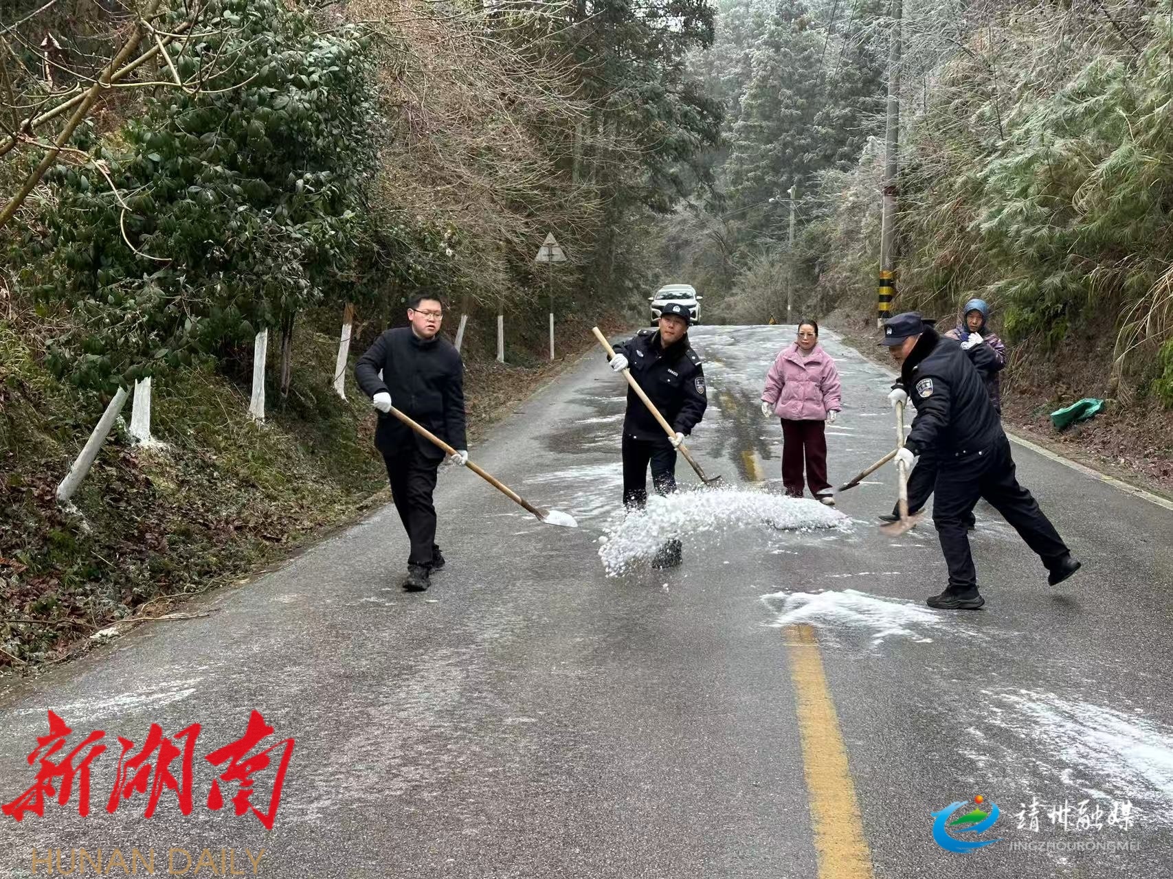 靖州融媒1月21日讯 (通讯员 曾杨)1月21日,靖州苗族侗族自治县三锹乡部分道路出现结冰现象,给群众出行和生产生活带来不便。该乡迅速启动应急预案,主要领导靠前指挥,组织乡镇干部、村“两委”成员、党员先锋队等多方力量,昼夜奋战在抗击冰雪、保障民生第一线,以实际行动践行初心使命,全力守护人民群众生命财产安全。