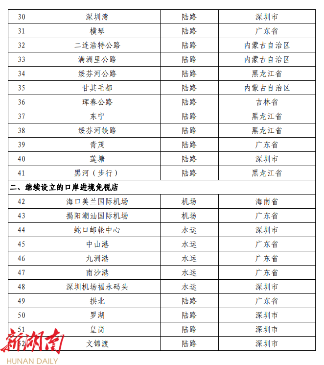 二、继续在海口美兰国际机场、蛇口邮轮中心等11个口岸设立口岸进境免税店(在本通知所附《设立口岸进境免税店名单》中为序号42—52)。