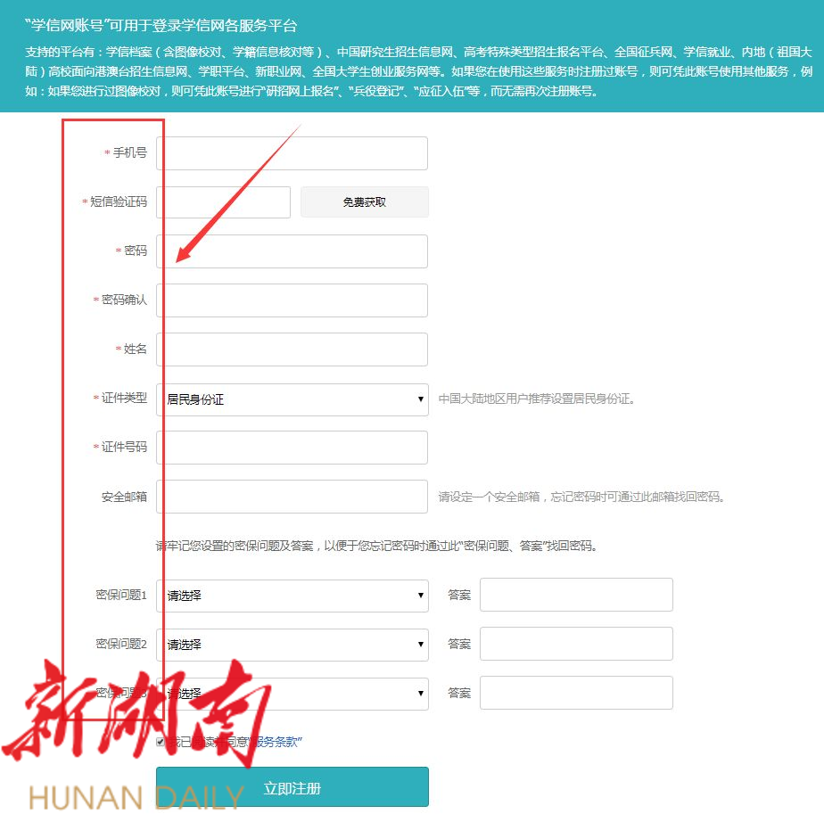 填写框内带*的全部内容,点击“立即注册”: