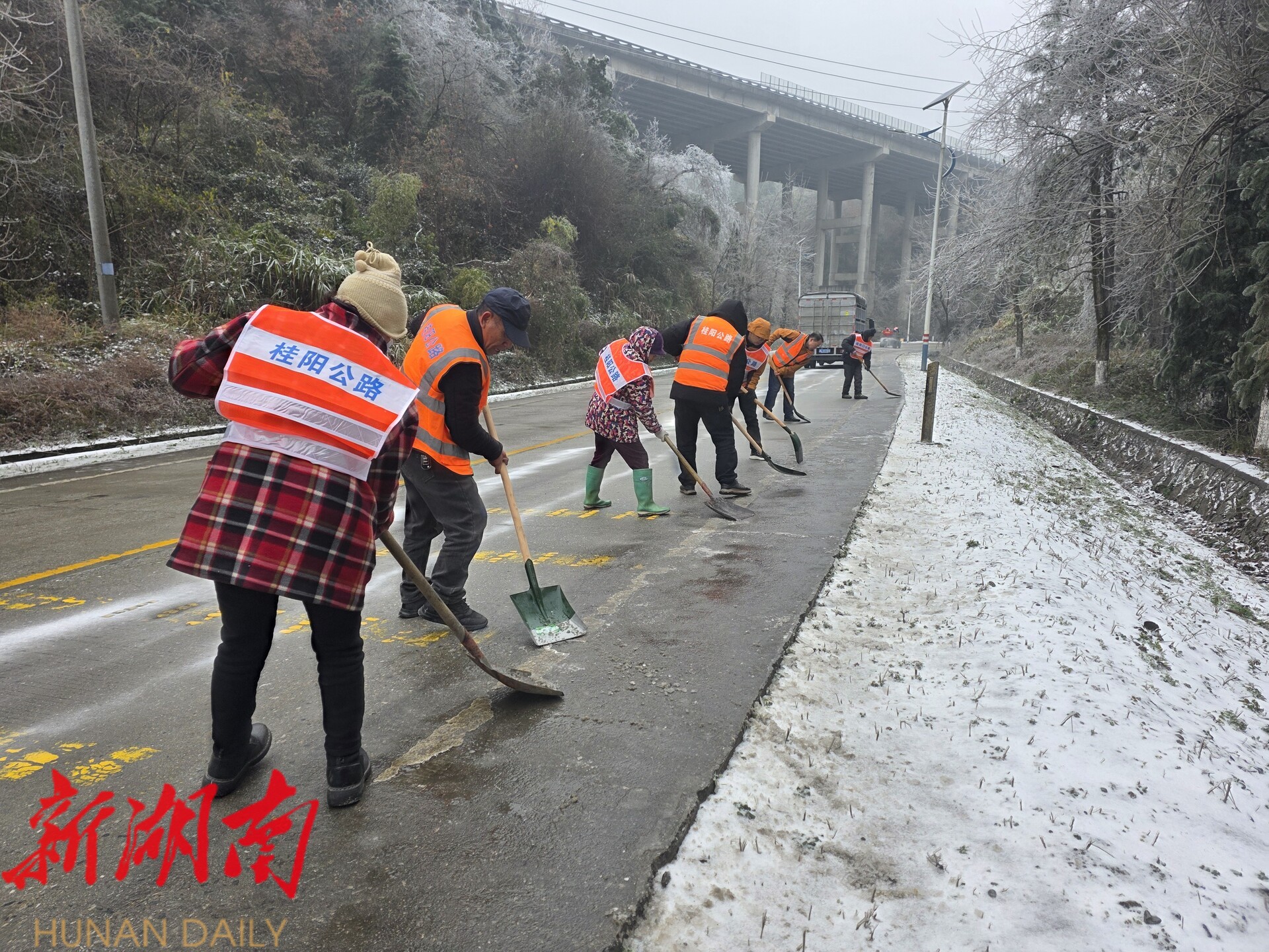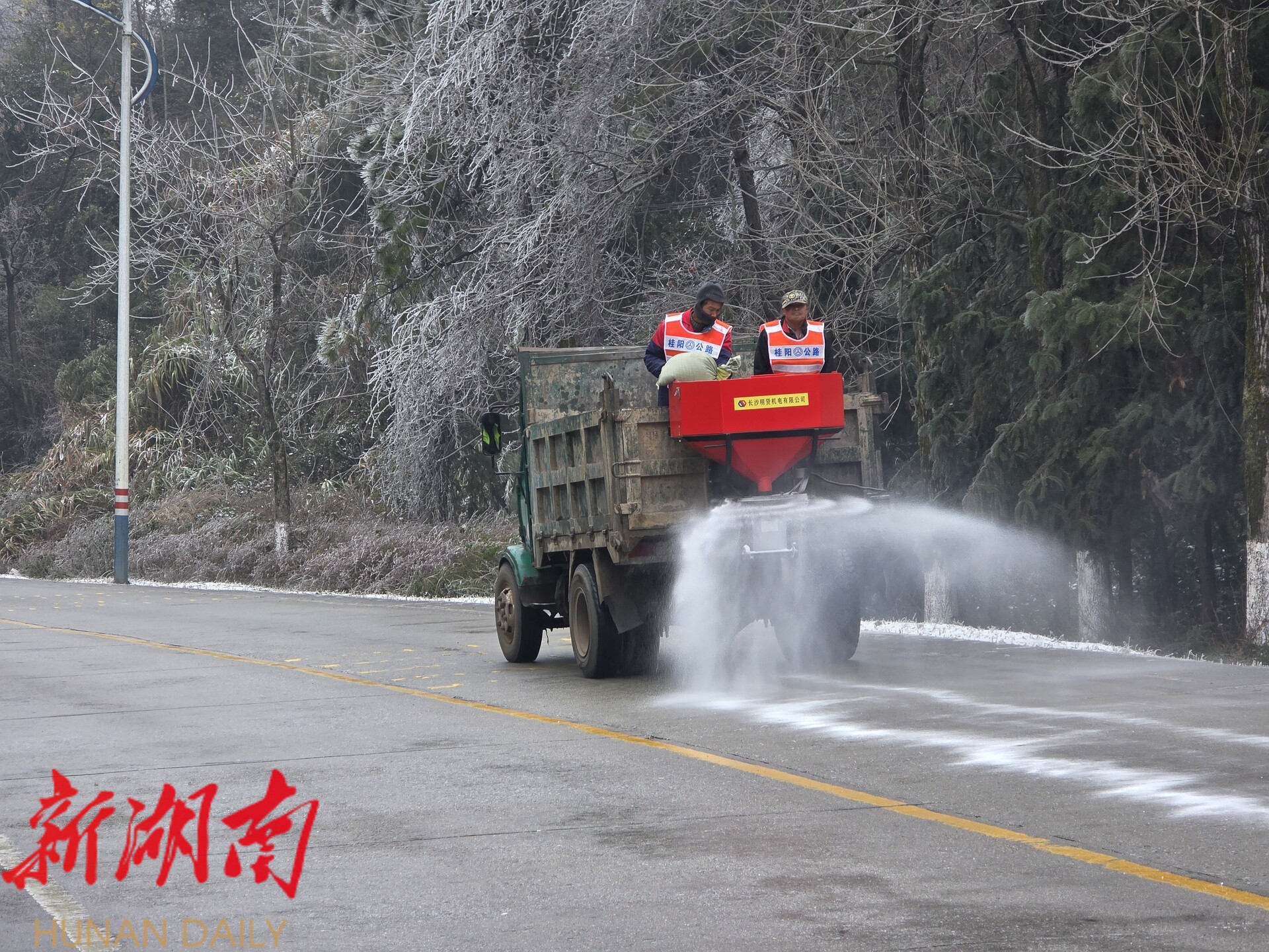 新桂阳1月22日讯(记者 李玮嘉 )1月21日,受强冷空气影响,我县气温骤降至0℃以下,我县S215线荷叶肖家山段、S222线莲塘腊园段、G357全线等高海拔路段出现路面结冰现象,给群众出行带来极大安全隐患。县公路建设养护中心迅速启动低温冰冻天气应急响应,组织抢险队伍开展融雪除冰作业,筑牢道路安全防线。