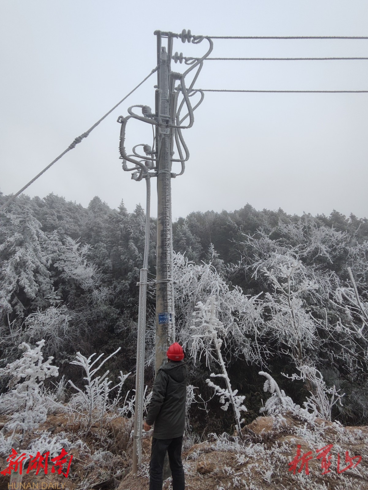 新蓝山客户端1月22日讯 (通讯员 黄章成 李和平)“10千伏浆普所云互联线路#060杆线路覆冰3mm,当前气温-5℃,需持续监测覆冰增速!”1月21日,凛冽寒风裹挟着低温侵袭蓝山县,国网蓝山县供电公司闻令而动,组织国家电网湖南电力东方红(松风)共产党员服务队,奔赴浆洞瑶族乡等高海拔重点区域,对往年易结冰线路开展寒潮特护特巡,以精准防控筑牢电网“防冻墙”,确保寒潮期间居民用电“热度不减、供电不断”。