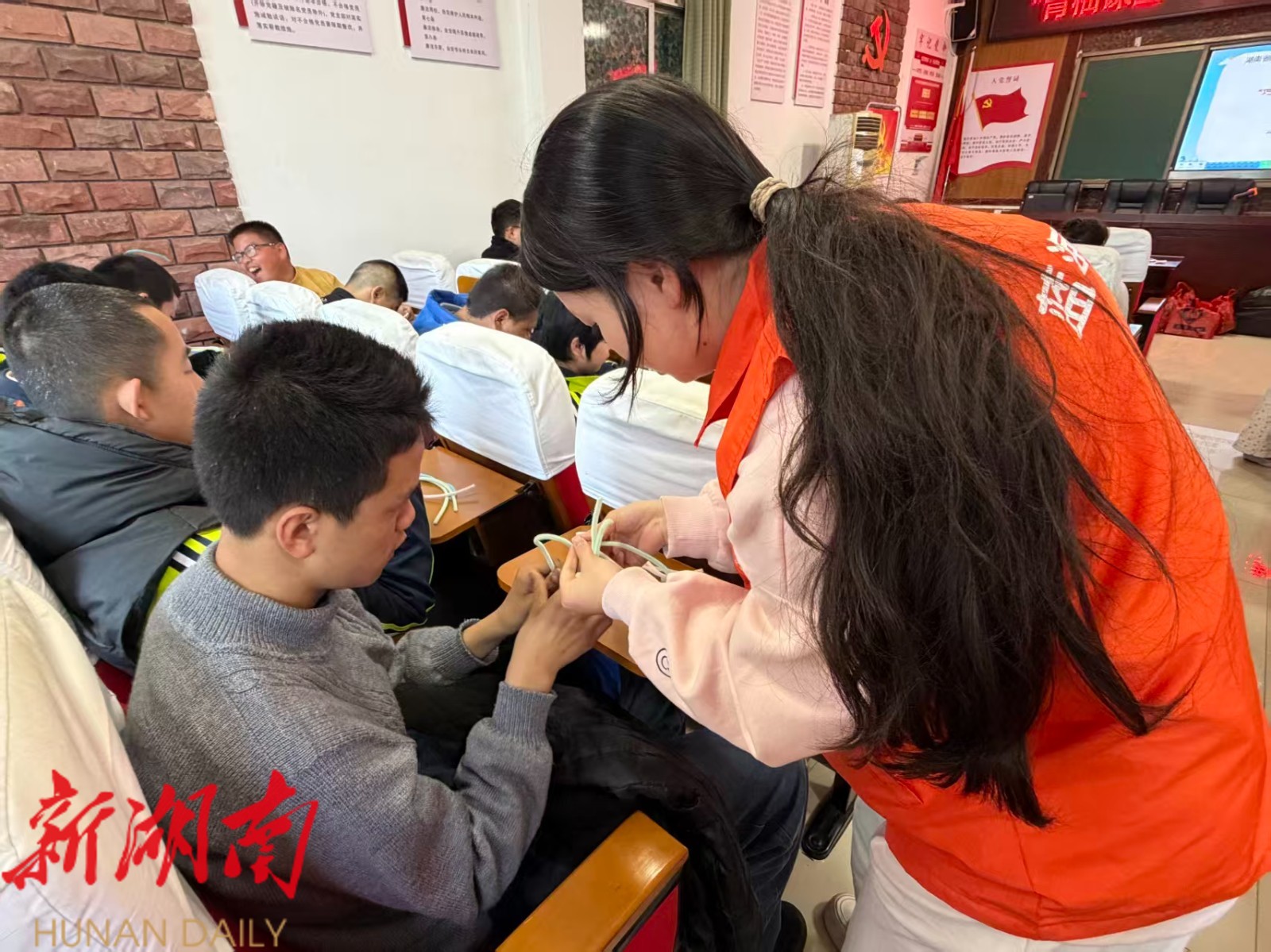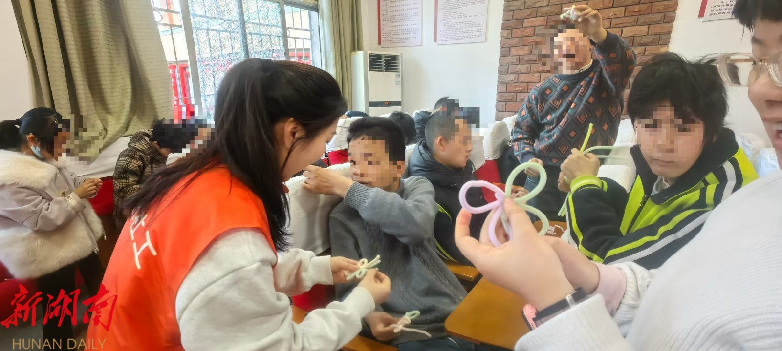 手工实践现场同样热闹,志愿者分组指导57名孩子用扭扭棒、超轻黏土制作星星、蝴蝶等造型手工作品。针对残障儿童特点,志愿者耐心拆分步骤、手把手协助,引导孩子们用作品表达对家人、老师、志愿者的感恩。“想把星星送给文老师”,一名聋哑儿童通过手语向志愿者传递心意,简单的表达里满是真诚。来自湘潭医卫职院护理学院的志愿者小晏说:“我们以为的很简单的扭扭棒做星星、做蝴蝶,对这些孩子来说,却是一个很难的过程,需要一步一步带着做,一个一个去指导,他们学东西真的是太难了。以后有机会我想去学手语,来长期做志愿者。”