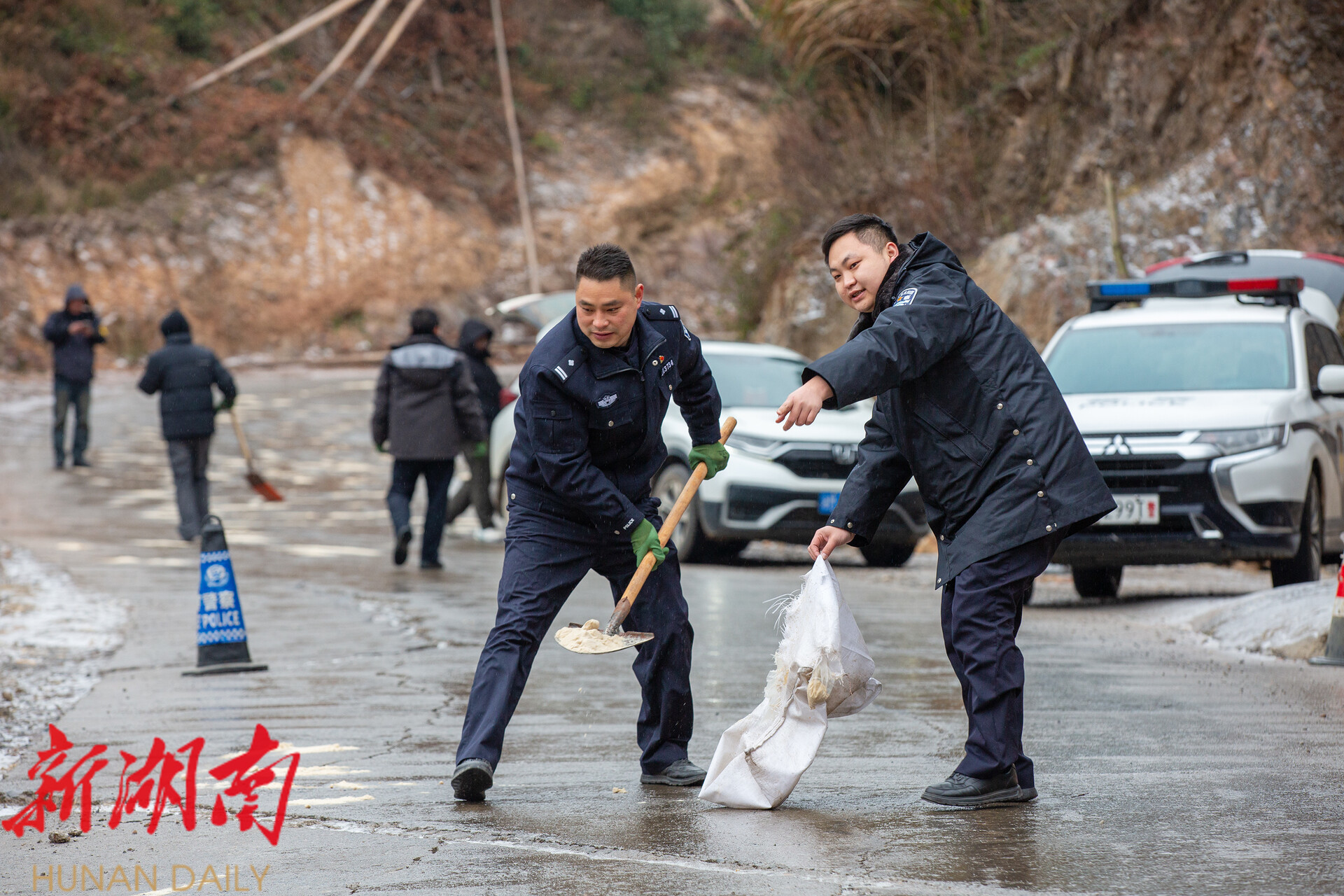 1月21日上午,五龙山派出所获悉辖区部分村庄路段结冰致车辆滞留后,迅速联合乡镇工作人员,携带工业盐、铲雪工具赶赴牛塘岭村、上庄源村等点位,开展撒盐除冰作业,快速打通出行梗阻。县交警大队提前部署应急防范,在易结冰路段、桥梁、急弯陡坡等重点区域,摆放锥筒划定警示区,设置安全提示牌,提醒驾驶员规避风险。同时加密巡逻频次,实时监测路况,排查隐患并引导车辆安全通行。