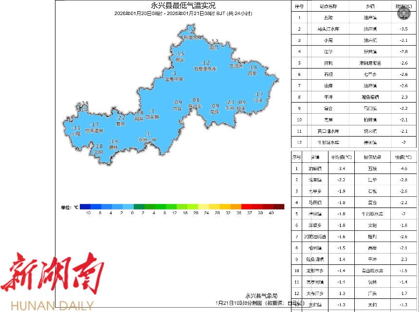 21日08时至22日08时,全县大部分乡镇出现小雨或冻雨,部分乡镇出现雨夹雪或冰粒,高海拔山区有冰冻,永兴国家气象站出现微量电线结冰。24小时区域气象站气温最低气温-4.9度(油麻镇五陵站)到-1.1度(大布江乡较头站),截止22日08时,全县51个自动气象站气温均低于0度,最低气温-4.7度(油麻镇五陵站,海拔高度501米),永兴国家站气温为-1.4度。