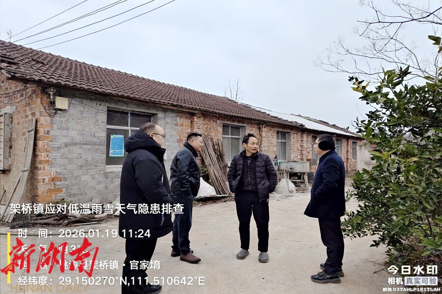 视外桃源客户端1月20日讯(通讯员:梅思宇)为有效应对即将到来的低温雨雪冰冻天气,切实保障辖区群众生命财产安全,尤其是五保户等特殊群体的温暖过冬,近日,架桥镇党委、政府迅速部署,组织镇村干部同步开展安全隐患排查与特殊群体走访帮扶行动,以 “全方位排查、零距离服务”筑牢冬季防灾减灾防线。