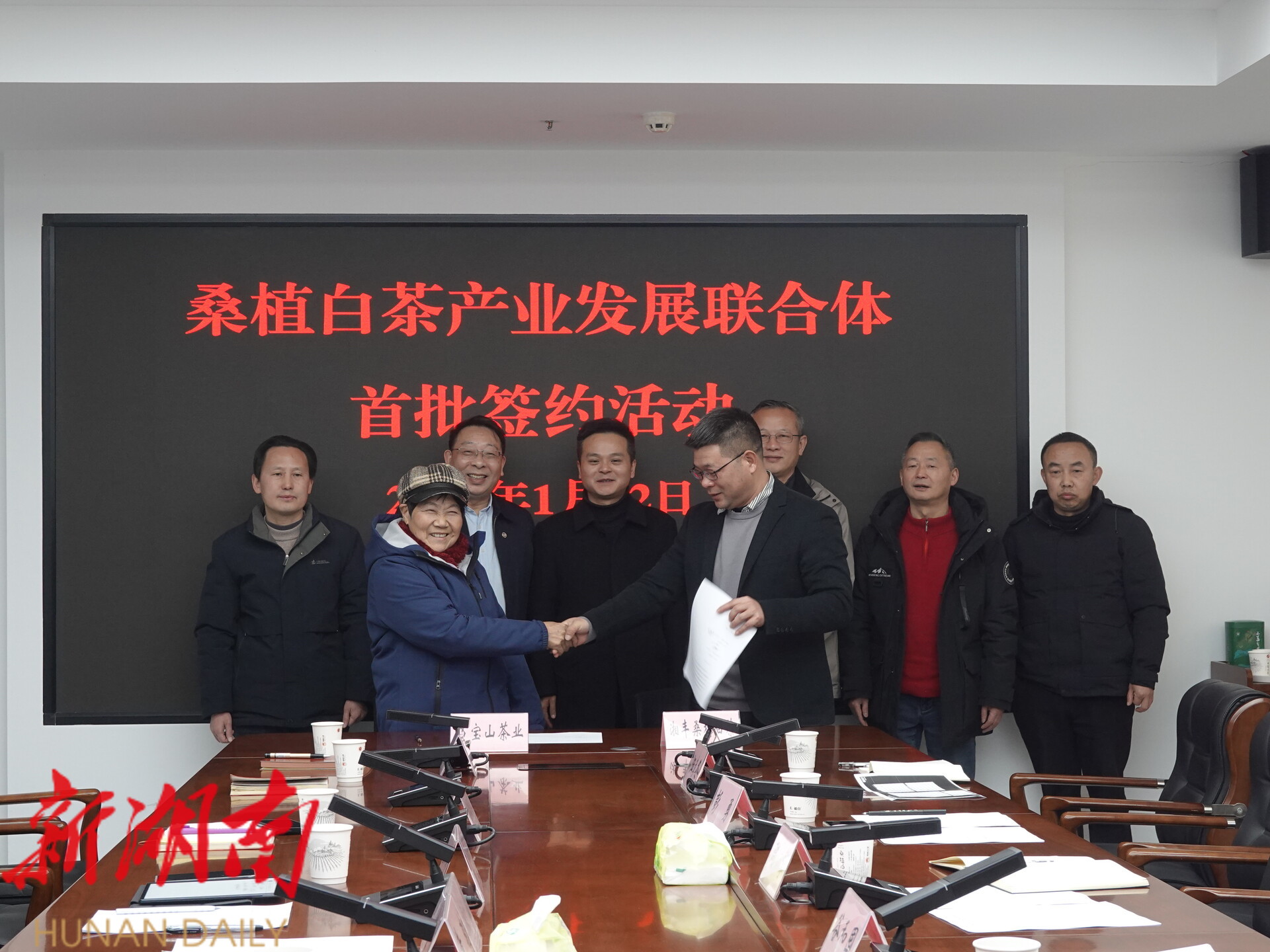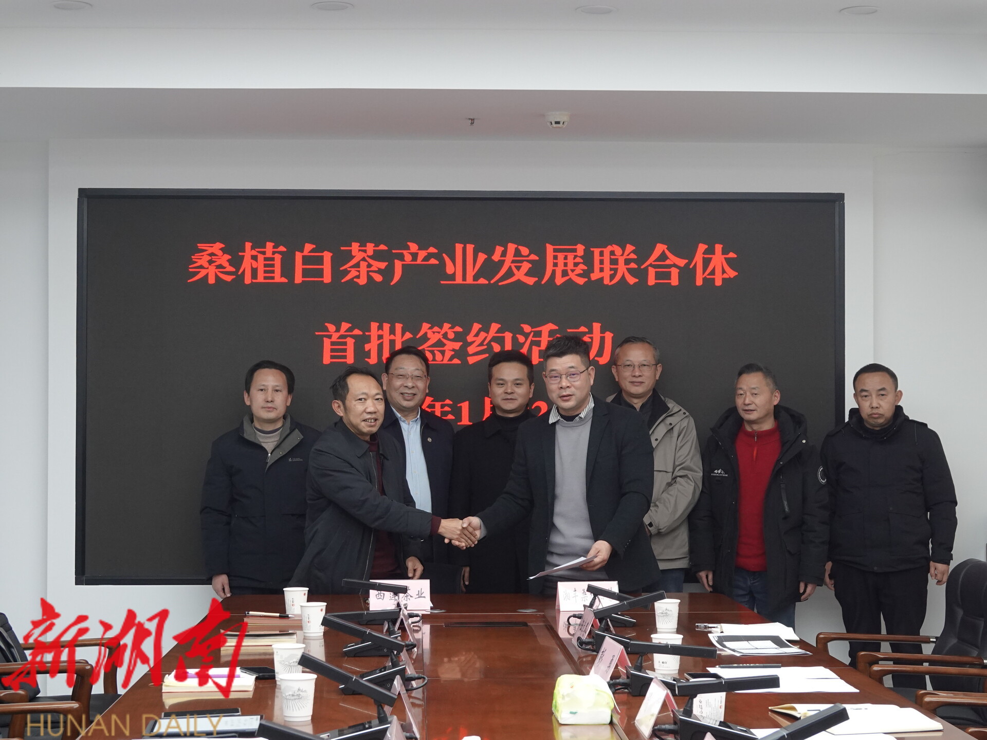 仪式上,湖南湘丰桑植 白茶 有限公司与张家界西莲茶业有限责任公司、张家界万宝山茶业有限公司、桑植县硒流塘茶叶种植专业合作社、桑植县清淼茶业有限公司四家首批意向成员企业现场签署了合作协议。