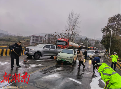 面对路面结冰险情,镇村应急力量协同交警部门火速出击。在结冰严重路段,第一时间设置警示标志,实施临时交通引导,分流车辆、疏散人群,全力保障人车安全。