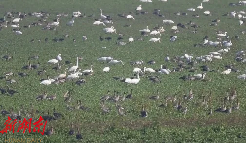 湖南西洞庭湖国家级自然保护区管理局工程师 刘鹏: 经过我们的监测人员的一些日常的一些工作(监测),碟形湖里面已经聚集了很多越冬候鸟,鸟的种类也比较多,我们现在比较突出的碟形湖,比如正喜障,目前上个月监测到大概是有1500左右的水鸟,主要就是国家的二级保护动物白琵鹭和小天鹅,它们大概有1200多只,此外还有一些苍鹭,一些野鸭。